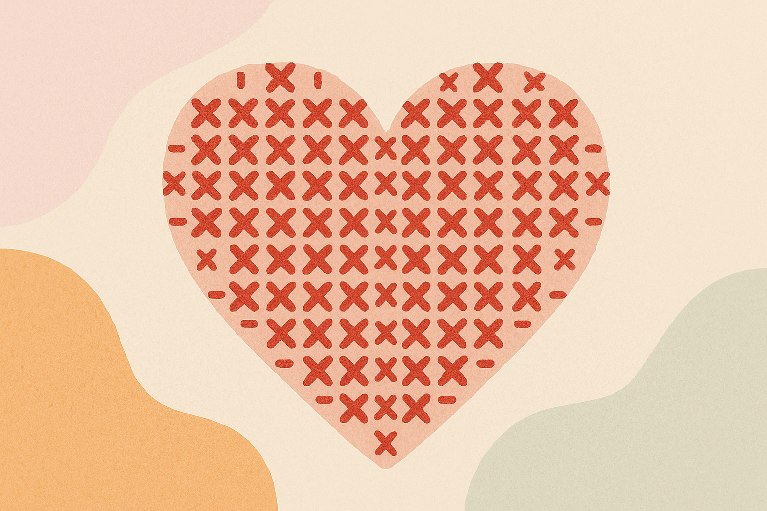 Fond crème avec un grand cœur central en motif de tissage orange brique. En bas, des icônes stylisées en tons doux (ocre, beige, terracotta) représentant une pelote de laine, une aiguille avec fil, des tissus empilés, un coussin à épingles, des feuilles et symboles de couture. Style minimaliste, palette pastel chaleureuse, ambiance artisanale et créative.