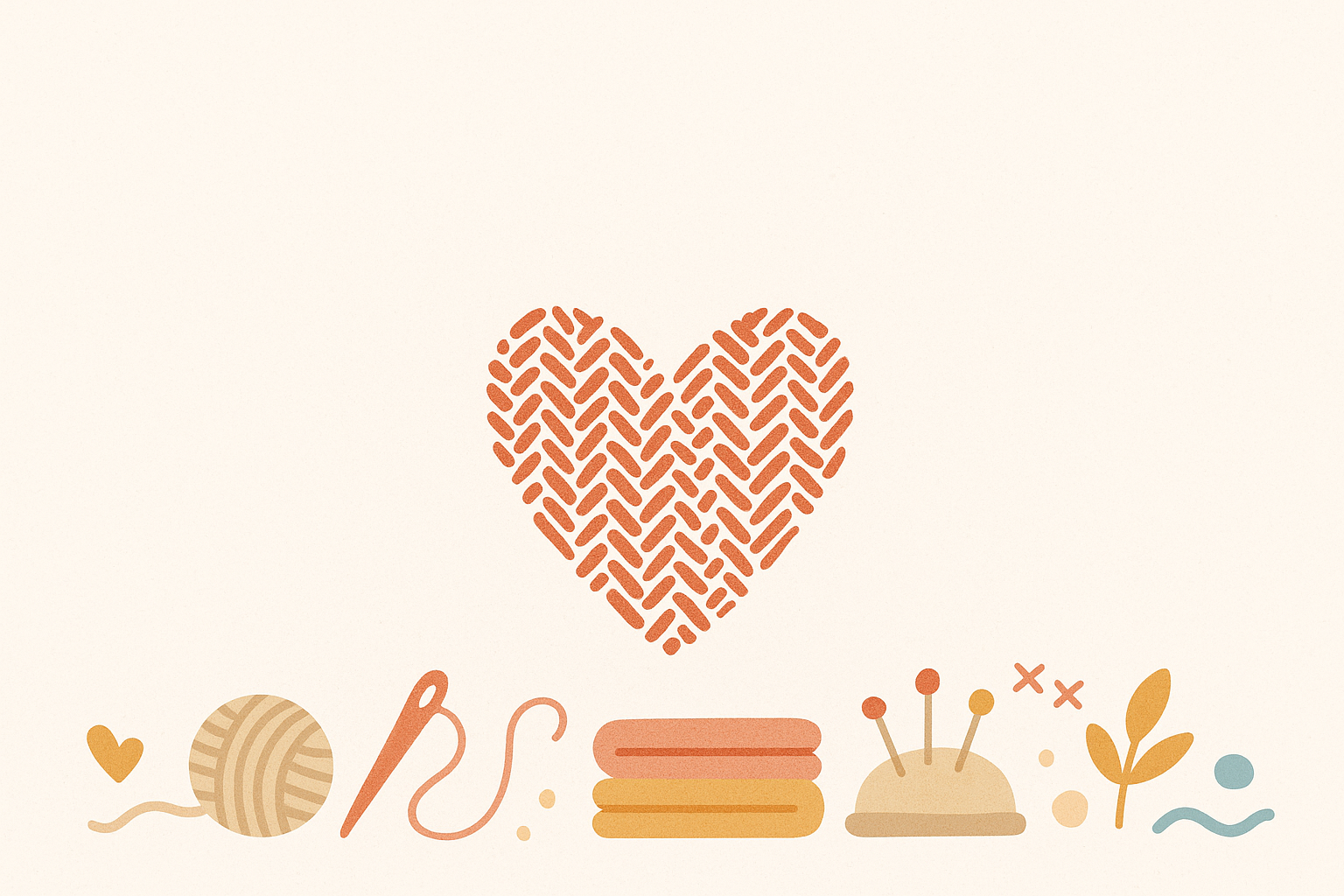Fond crème avec un grand cœur central en motif de tissage orange brique. En bas, des icônes stylisées en tons doux (ocre, beige, terracotta) représentant une pelote de laine, une aiguille avec fil, des tissus empilés, un coussin à épingles, des feuilles et symboles de couture. Style minimaliste, palette pastel chaleureuse, ambiance artisanale et créative.