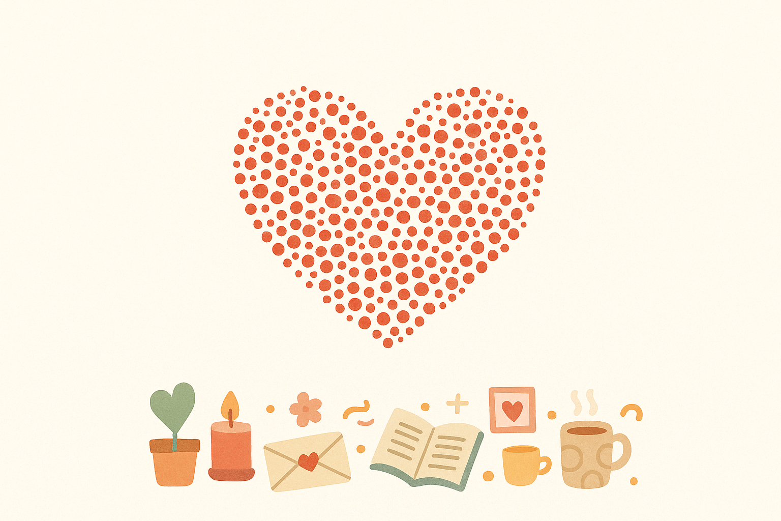 Illustration minimaliste sur fond crème avec un grand cœur rouge formé de points de tailles variées au centre. En bas, une rangée d’éléments doux et chaleureux : plante en pot, bougie, enveloppe avec cœur, fleur, livre ouvert, cadre avec cœur, tasses de café. Palette pastel dans les tons rouge, orange, vert olive et beige, style doux et épuré, ambiance cosy et professionnelle.
