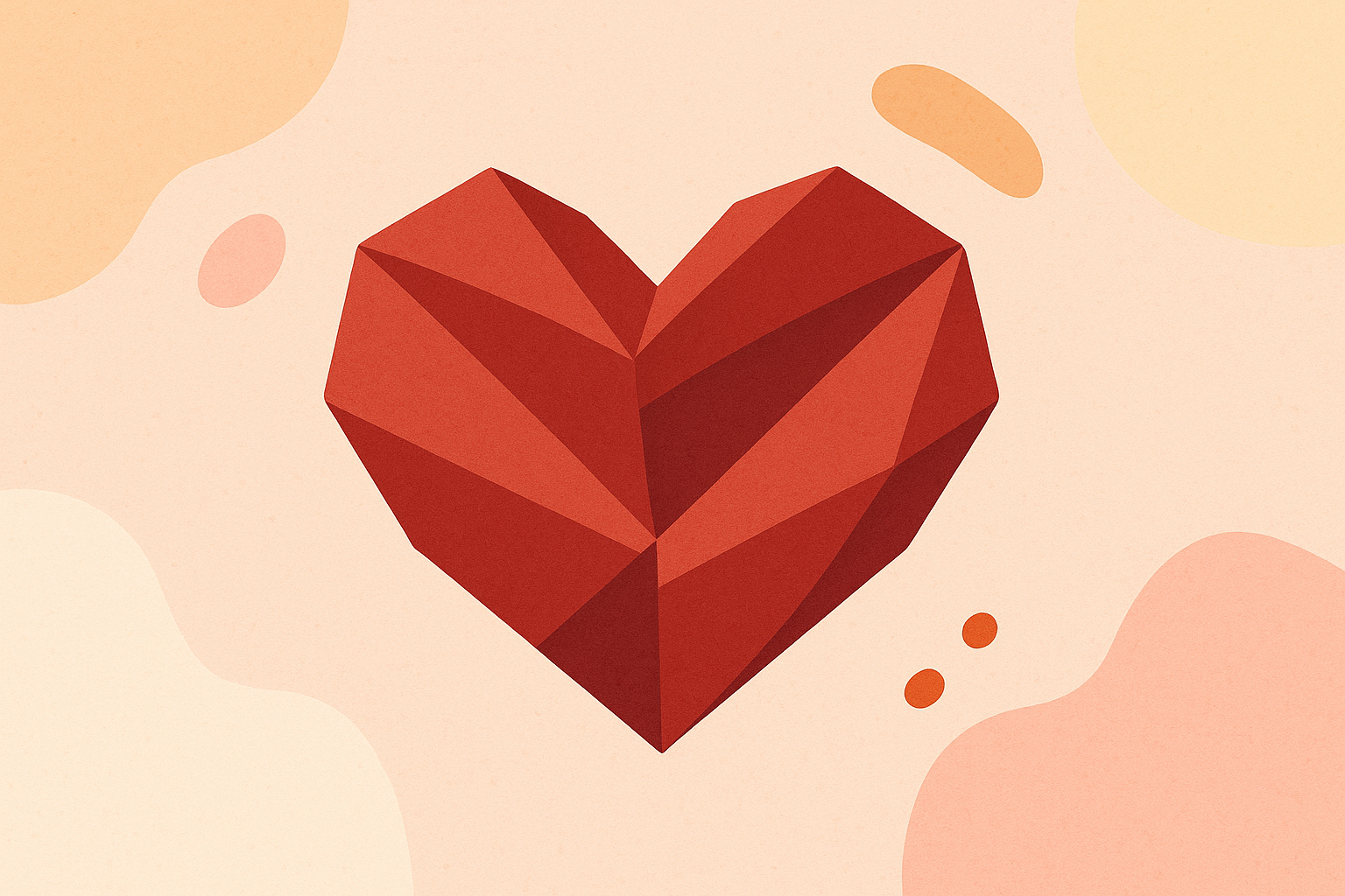 Illustration minimaliste avec un grand cœur rouge géométrique au centre, entouré d’éléments décoratifs comme des tasses, un crayon bleu, un vase orange avec des fleurs, des cœurs, et des formes abstraites. Palette de couleurs douces et chaudes : rouge brique, pêche, orange, jaune, vert olive et bleu pastel. Style plat, épuré et chaleureux, parfait pour ambiance professionnelle conviviale.