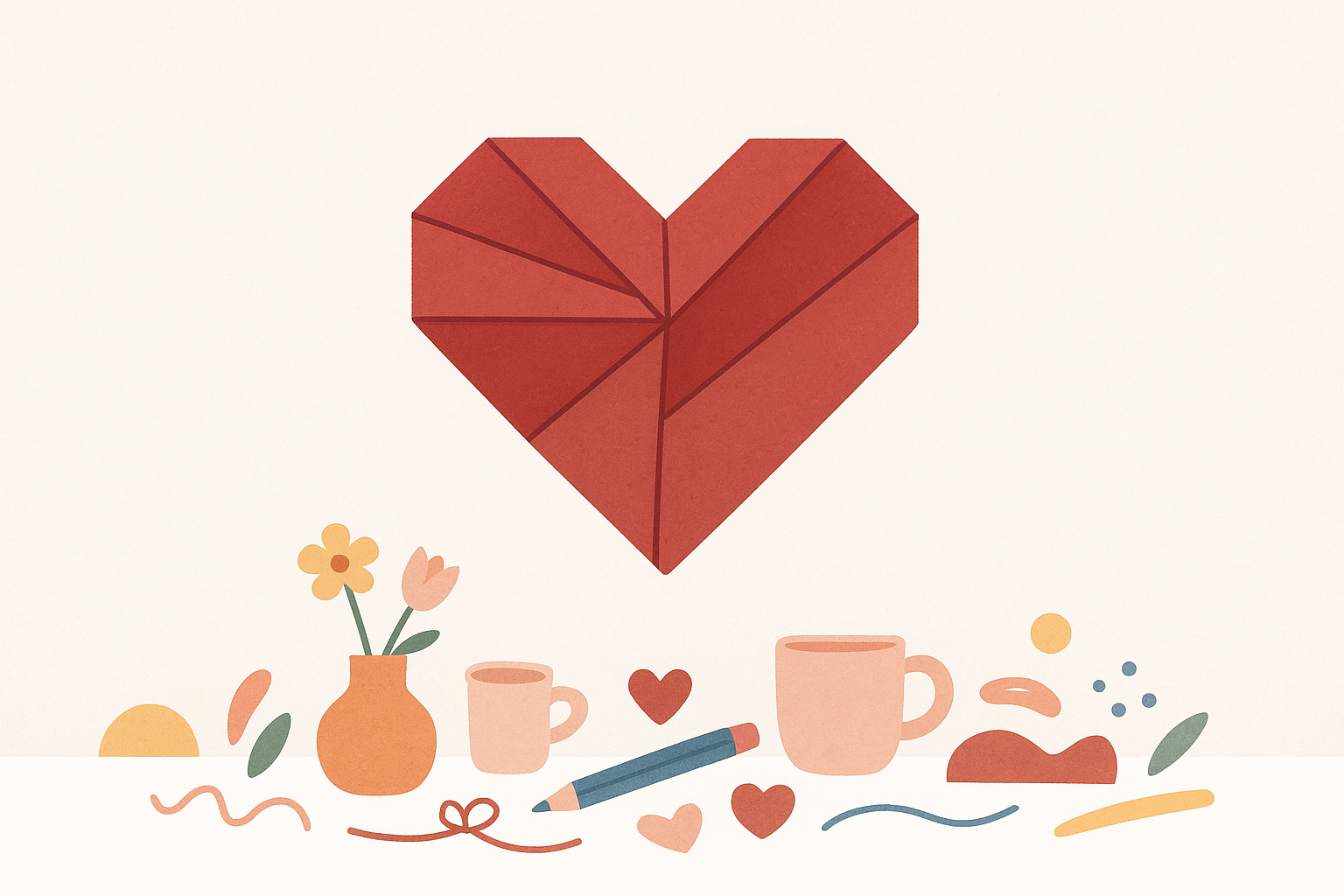 Illustration minimaliste avec un grand cœur rouge géométrique au centre, entouré d’éléments décoratifs comme des tasses, un crayon bleu, un vase orange avec des fleurs, des cœurs, et des formes abstraites. Palette de couleurs douces et chaudes : rouge brique, pêche, orange, jaune, vert olive et bleu pastel. Style plat, épuré et chaleureux, parfait pour ambiance professionnelle conviviale.