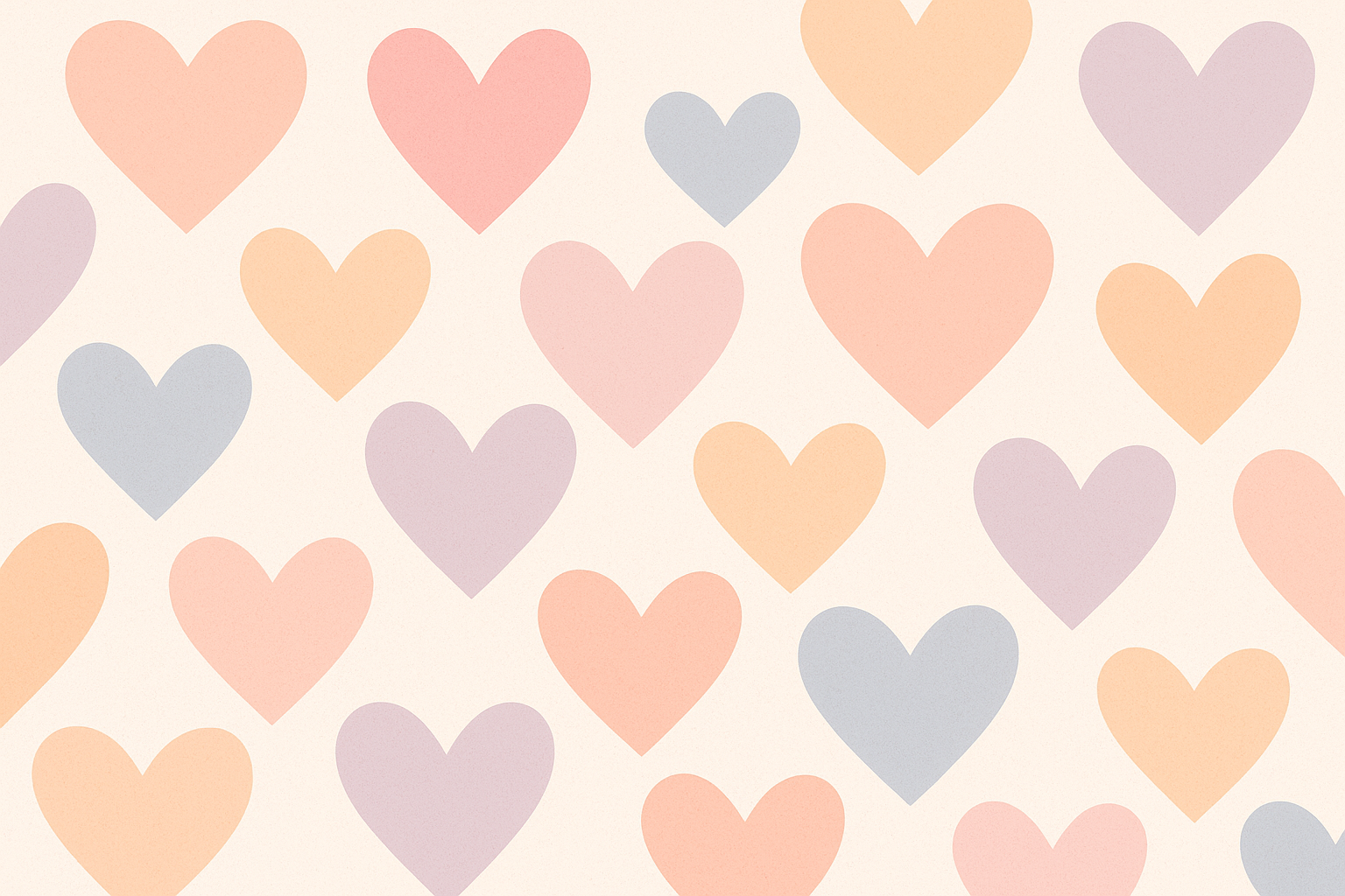 Fond crème texturé avec une rangée de cœurs pastel alignés en bas, dans des tons doux de rose, violet, bleu et pêche. Motif symétrique et répétitif, style minimaliste et épuré, ambiance chaleureuse et professionnelle. Idéal pour recherches incluant : pastel, cœurs, fond clair, design doux, communication visuelle.