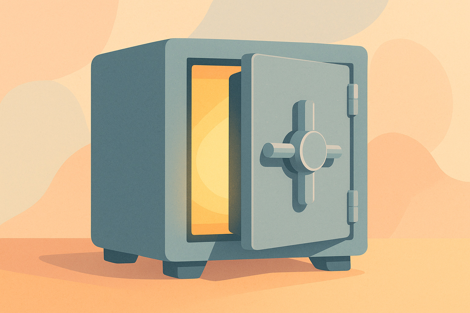 Illustration vectorielle épurée avec un coffre-fort gris ouvert, pièce dorée avec symbole dollar, carte bancaire orange, flèches directionnelles, feuilles vertes et formes géométriques abstraites. Palette de couleurs pastel douces : gris, orange, jaune doré et vert. Style minimaliste et professionnel, parfait pour des thèmes de sécurité, finance, banque ou investissement.