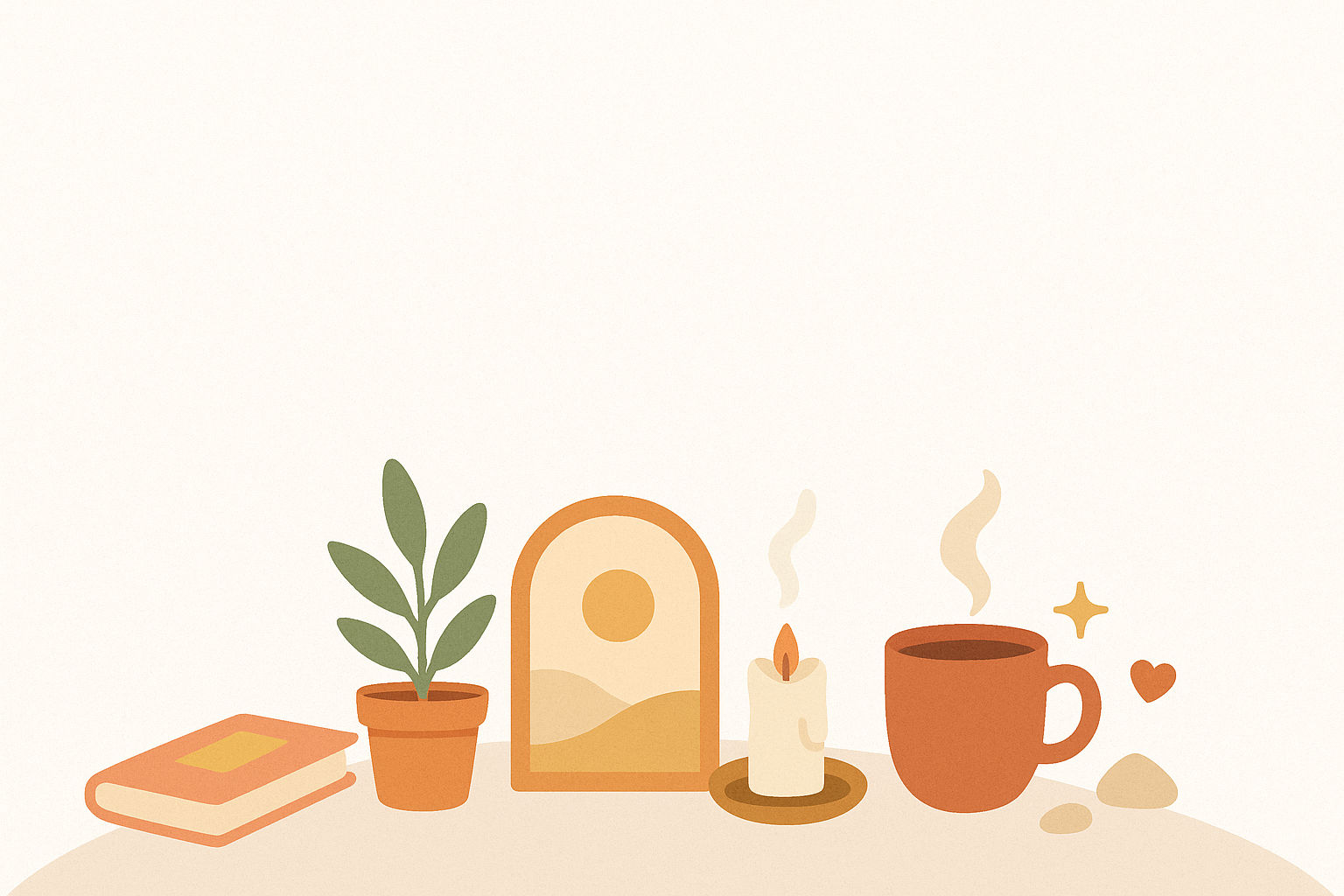 Illustration minimaliste aux tons doux beige, terracotta et vert olive, représentant un bureau avec une tasse fumante, une bougie allumée, un petit cadre, un pot de plante verte, un livre fermé et des éléments décoratifs comme un cœur, une étoile et des galets. Style épuré et chaleureux, ambiance cosy et professionnelle, parfaite pour arrière-plan de carte postale d'affaires.