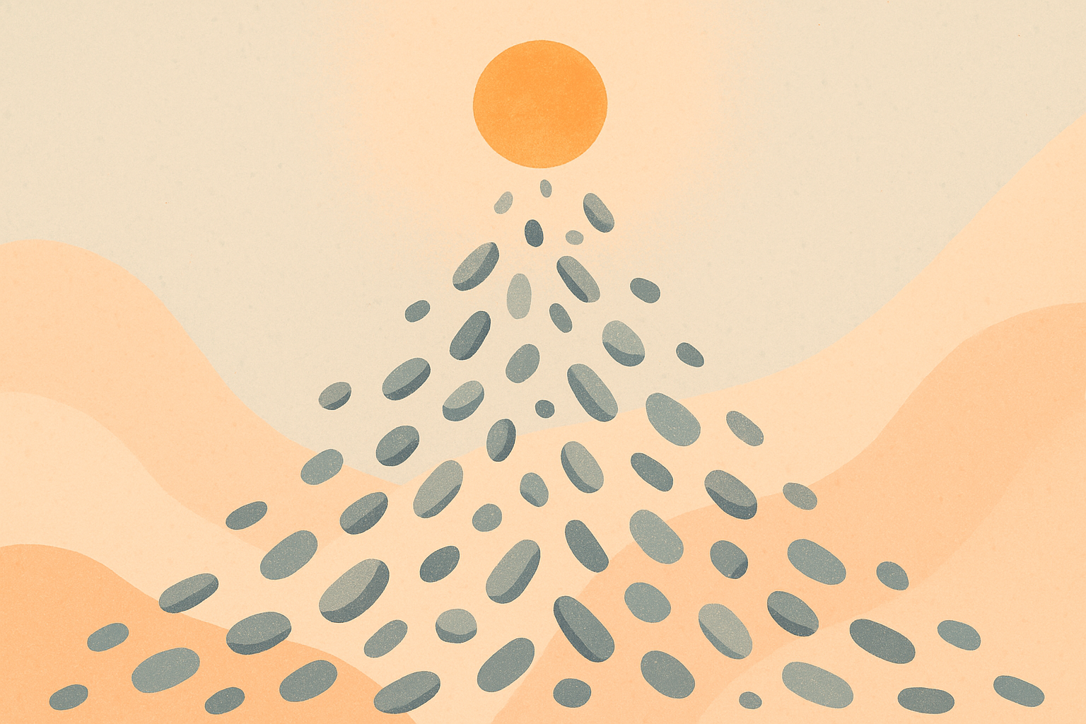 Illustration minimaliste style flat design avec une palette pastel douce : beige, orange, vert foncé et bleu canard. Éléments visuels : fenêtre arrondie, plante en pot, lampe de bureau orange, tasse, livre, petites icônes décoratives (étoile, fleur, lumière). Composition centrée en bas avec grand espace vide en haut pour texte ou message. Ambiance cosy et professionnelle, parfaite pour visuels de cartes postales d'affaires.