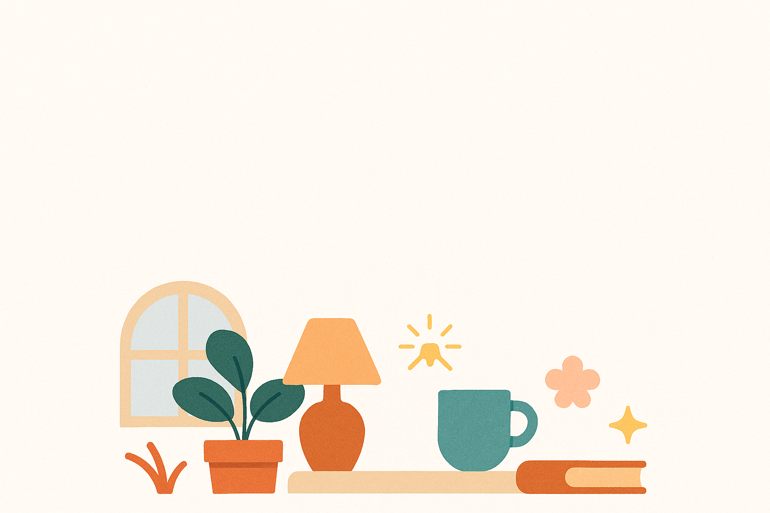 Illustration minimaliste style flat design avec une palette pastel douce : beige, orange, vert foncé et bleu canard. Éléments visuels : fenêtre arrondie, plante en pot, lampe de bureau orange, tasse, livre, petites icônes décoratives (étoile, fleur, lumière). Composition centrée en bas avec grand espace vide en haut pour texte ou message. Ambiance cosy et professionnelle, parfaite pour visuels de cartes postales d'affaires.