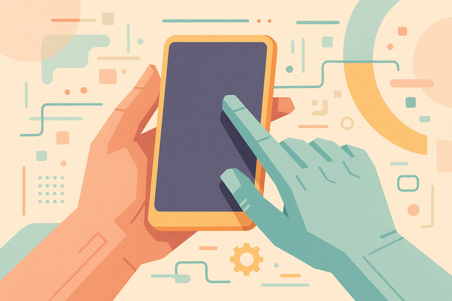Illustration vectorielle minimaliste avec deux mains stylisées (humaine et robotique) interagissant autour d'une interface numérique. Palette de couleurs douces et pastel : beige, bleu-gris, pêche et vert olive. Éléments géométriques abstraits (cercles, triangles, carrés, circuits imprimés) évoquant la technologie, la communication et l'innovation dans un style épuré et professionnel.