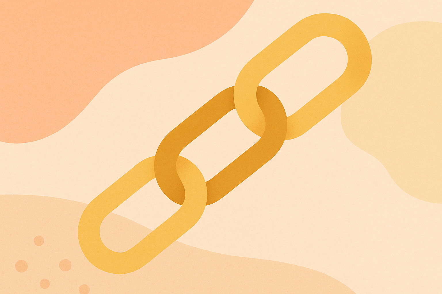 Illustration vectorielle aux tons doux beige, orange, jaune et vert, représentant une poignée de main, des pièces de puzzle, un cœur, une chaîne dorée, une plante en pot et des flèches. Style plat et minimaliste avec des formes abstraites et des symboles de coopération, de croissance et de lien professionnel. Fond clair avec espace vide en haut pour l'ajout de texte personnalisé.