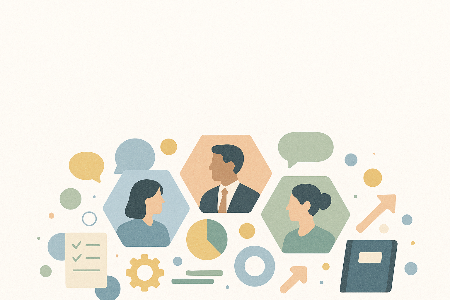 Illustration vectorielle aux tons pastel doux (beige, bleu, vert, jaune, orange) représentant trois personnages en costume ou tenue professionnelle dans des formes géométriques (hexagones). Autour d'eux, des éléments visuels comme bulles de dialogue, flèches, engrenage, graphique circulaire, carnet et checklist symbolisent la communication, le travail d’équipe et la gestion de projet. Style épuré, moderne et professionnel sur fond clair.