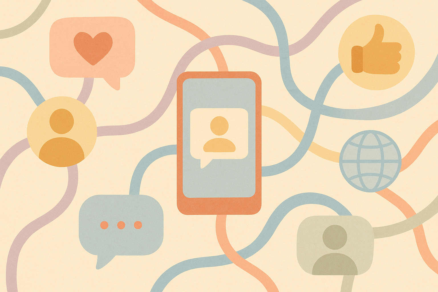 Illustration vectorielle en tons pastel doux avec un ordinateur portable affichant une bulle de cœur rouge, une tasse de café crème, un smartphone bleu, une plante verte en pot jaune et des icônes de communication comme le pouce levé, le cœur et l'arobase. Fond blanc cassé avec des lignes ondulées colorées (orange, bleu, saumon) évoquant la connectivité. Style minimaliste et chaleureux, parfait pour un usage professionnel moderne.