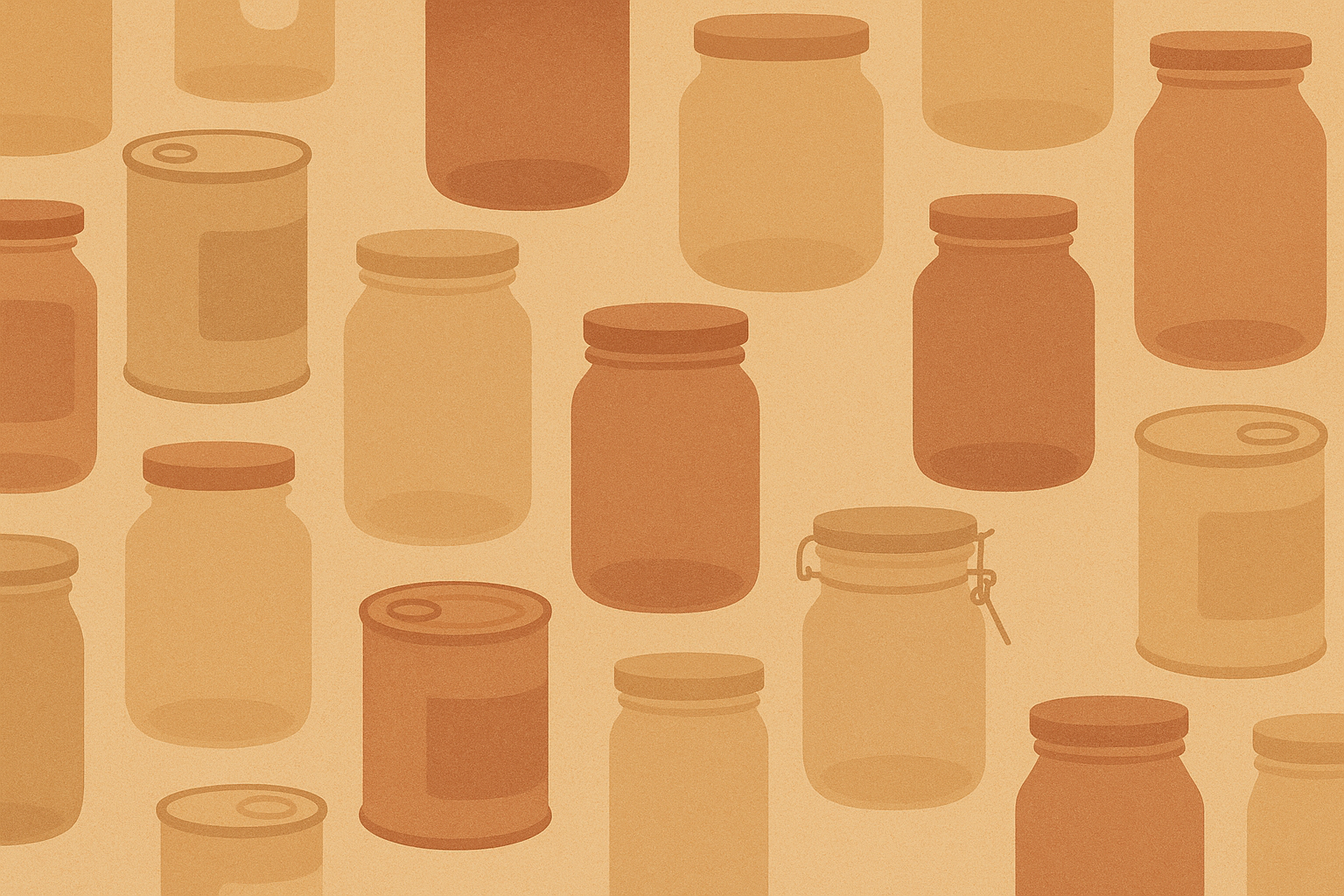 Illustration minimaliste de bocaux, boîtes de conserve, pots et bouteilles en tons bruns, beige et caramel sur fond crème. Style plat, texture papier, ambiance artisanale et naturelle. Parfait pour des visuels liés à l'alimentation, la production locale ou les produits faits maison.