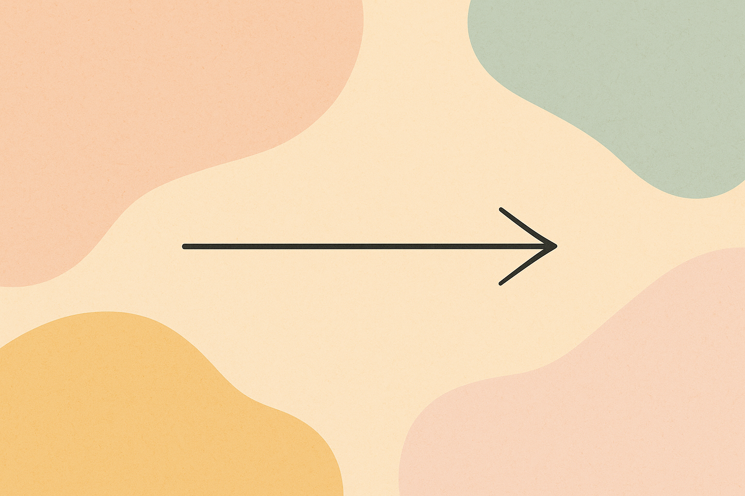 Illustration minimaliste avec flèche noire ascendante au centre sur fond blanc cassé, entourée de formes géométriques abstraites en tons pastel (vert sauge, terracotta, jaune moutarde, rose pâle). Éléments visuels incluent feuilles stylisées, arcs, cercles, étoiles et fleurs. Style moderne, épuré et professionnel, parfait pour visuels d’entreprise et cartes postales de communication.