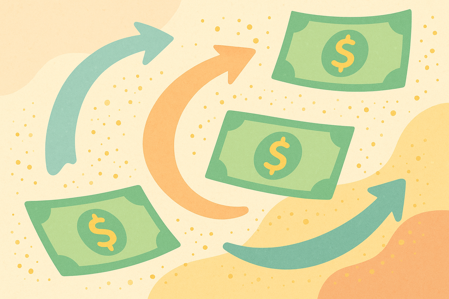 Illustration vectorielle avec des piles de pièces dorées, des flèches orange symbolisant la croissance, un billet vert, un symbole dollar, et des éléments décoratifs verts et jaunes. Le style est plat et minimaliste, avec une palette pastel sur fond beige clair, évoquant la finance, l'économie et la rentabilité dans un ton moderne et professionnel.