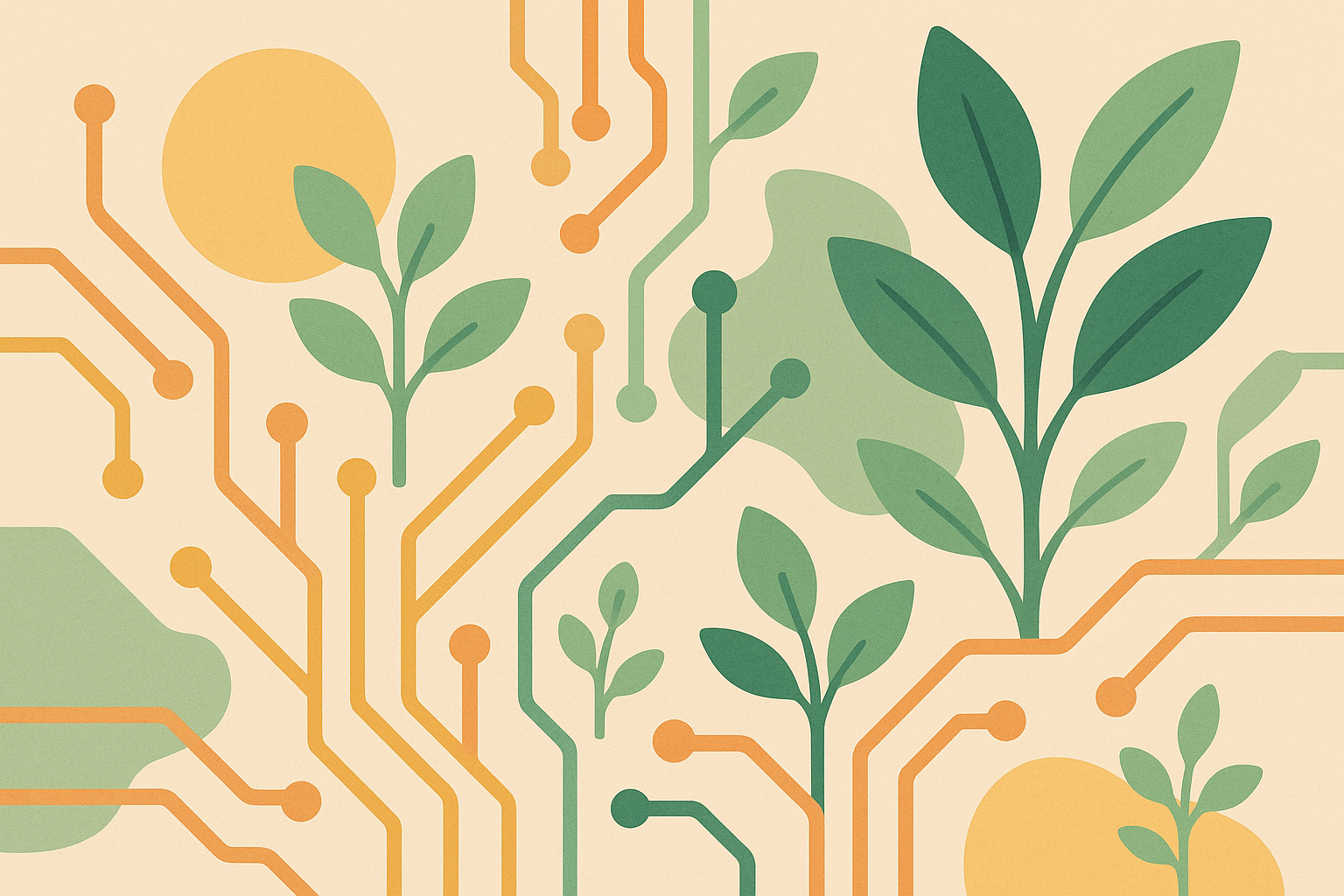 Illustration minimaliste avec des circuits imprimés orange clair se transformant en tiges végétales vertes aux feuilles stylisées. Palette de couleurs douces avec des tons crème, vert sauge et vert olive. Style épuré et contemporain, combinant nature et technologie, avec un espace vide à gauche pour le texte ou le message.