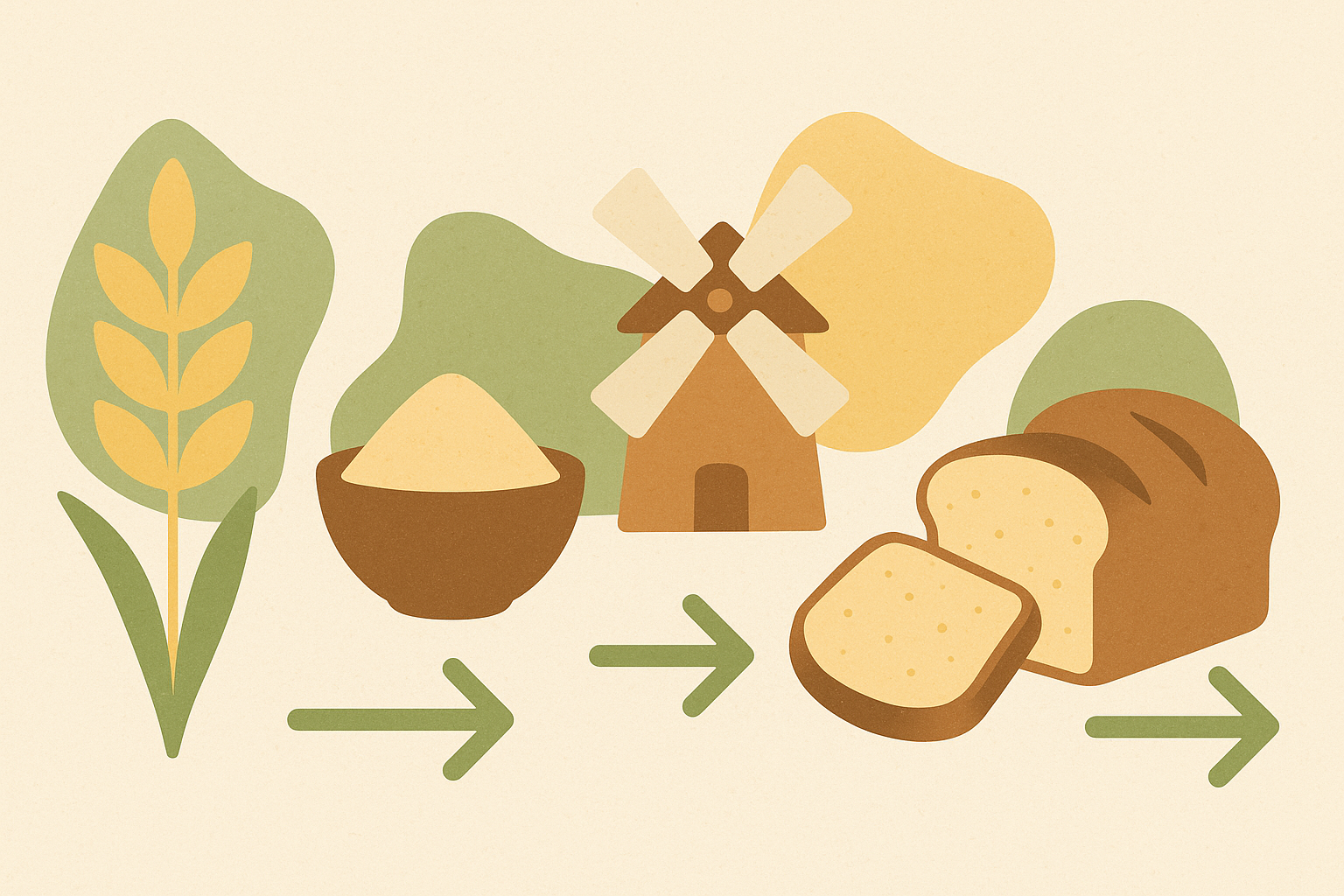 Illustration vectorielle minimaliste aux tons doux et naturels (ocre, vert olive, beige) représentant le cycle du blé : épi, graines, sac de farine, bol, cuillère et pain. Style plat et épuré avec éléments géométriques simples sur fond crème texturé. Parfait pour thèmes agricoles, artisanaux ou durables.