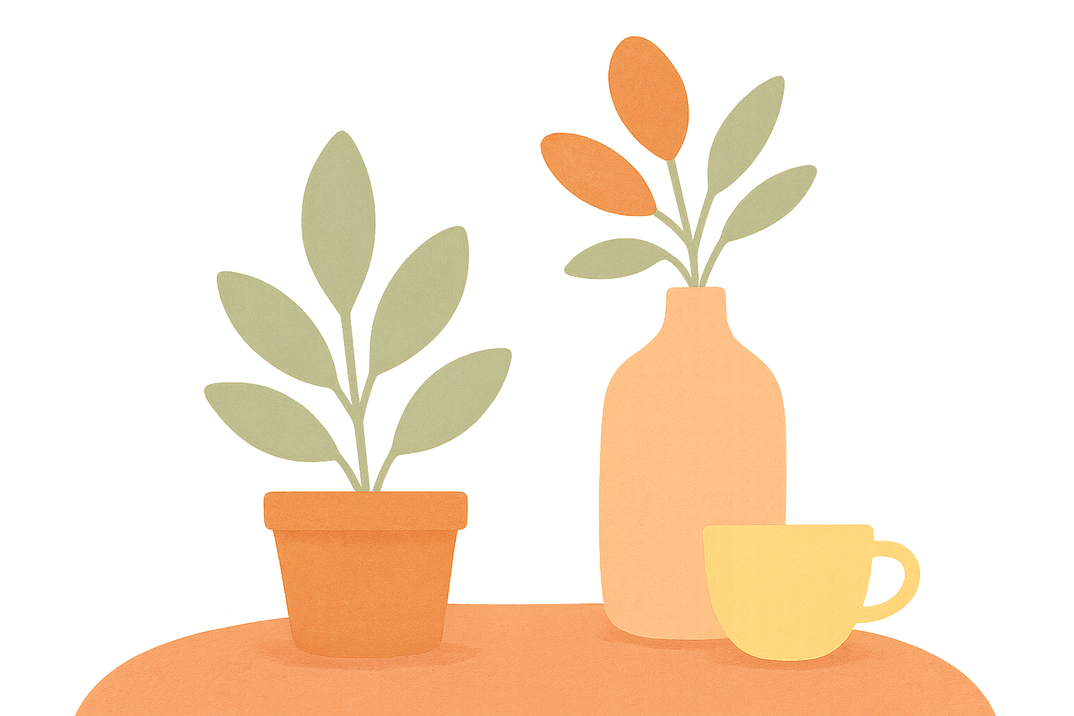 Illustration abstraite avec des formes géométriques douces représentant une tasse rose pâle, un coussin orange, un arc-en-ciel ocre, un vase bleu avec des feuilles vertes, une bougie, des feuilles stylisées et des éléments décoratifs en tons pastel. Fond dégradé chaud allant du doré au brun clair avec un léger effet de lumière diffuse. Style minimaliste, ambiance naturelle et apaisante, parfaite pour un usage professionnel ou commercial.