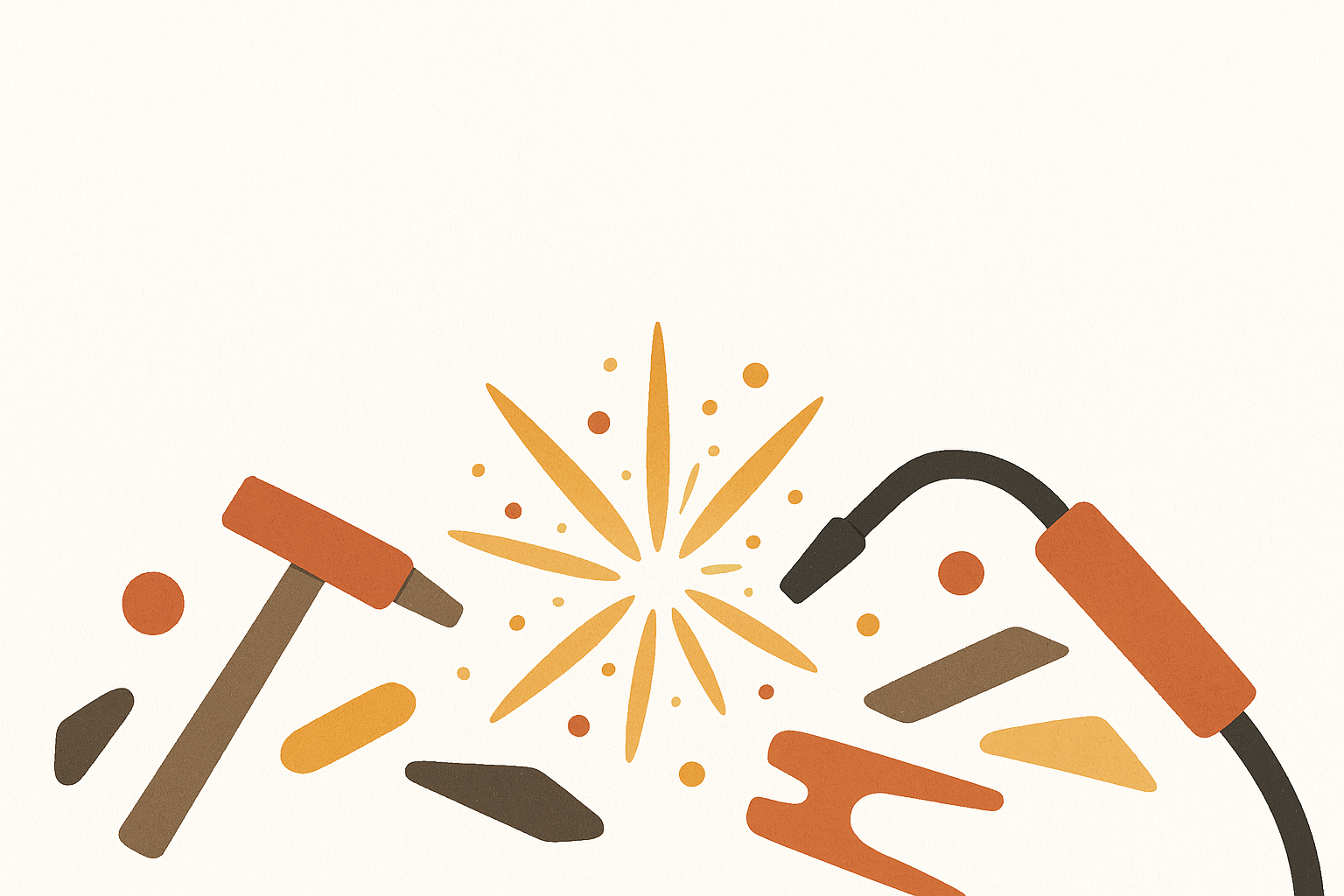 Illustration vectorielle avec des outils industriels stylisés comme un marteau et un chalumeau, entourés d’éclats et de particules en jaune, orange et brun sur fond crème. Le style est minimaliste avec des formes géométriques nettes et des couleurs chaudes évoquant l’énergie, la fabrication et le travail manuel. Idéal pour des visuels liés à l’ingénierie, la production ou l’artisanat.