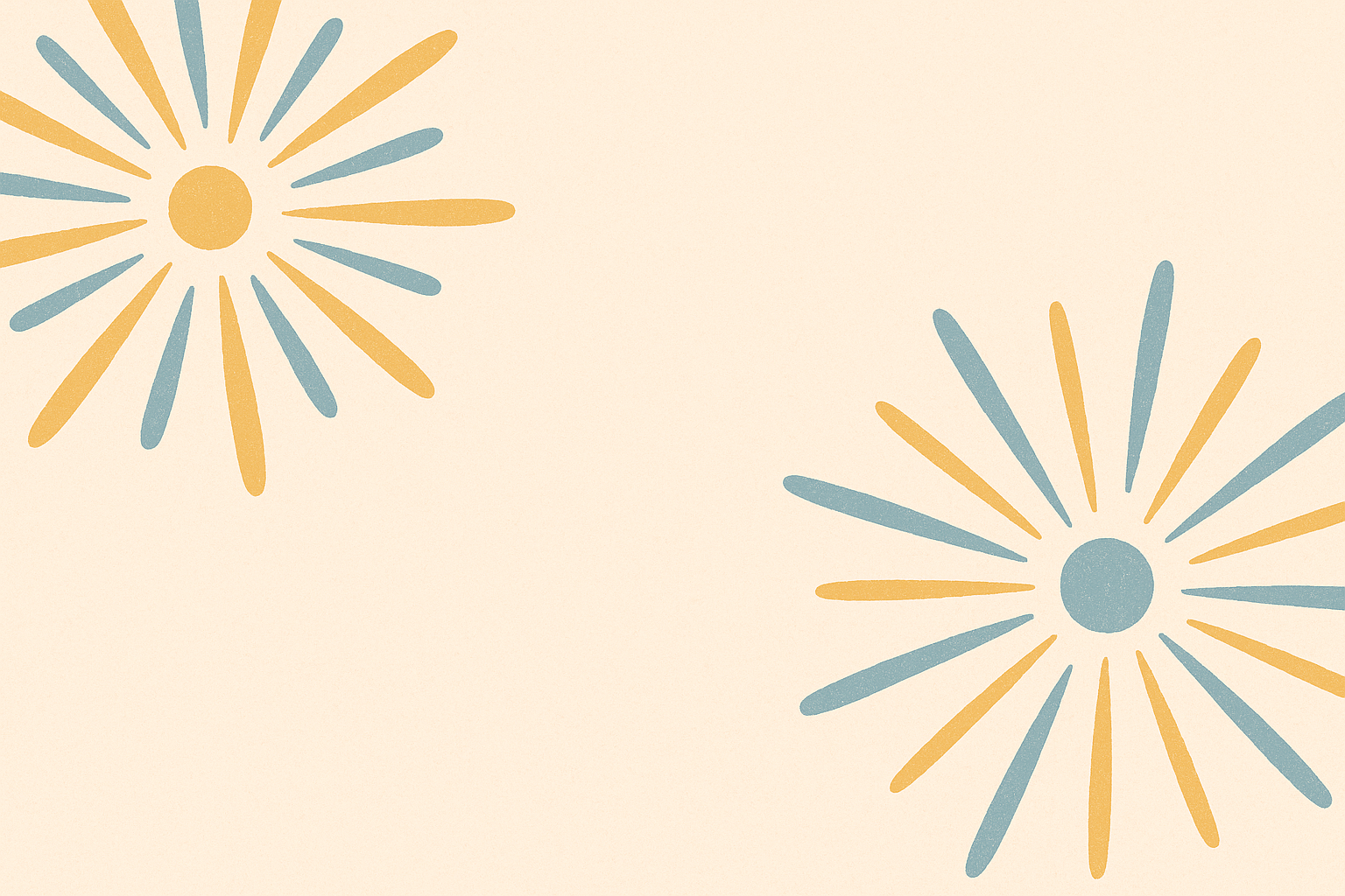 Fond crème avec motifs graphiques de feux d’artifice stylisés en jaune moutarde et bleu pastel, disposés en bas de l’image. Les formes sont rayonnantes, arrondies et dynamiques, évoquant des éclats ou des étoiles. Le style est minimaliste, festif et professionnel, avec une grande zone vide en haut pour l’ajout de texte ou de message personnalisé.