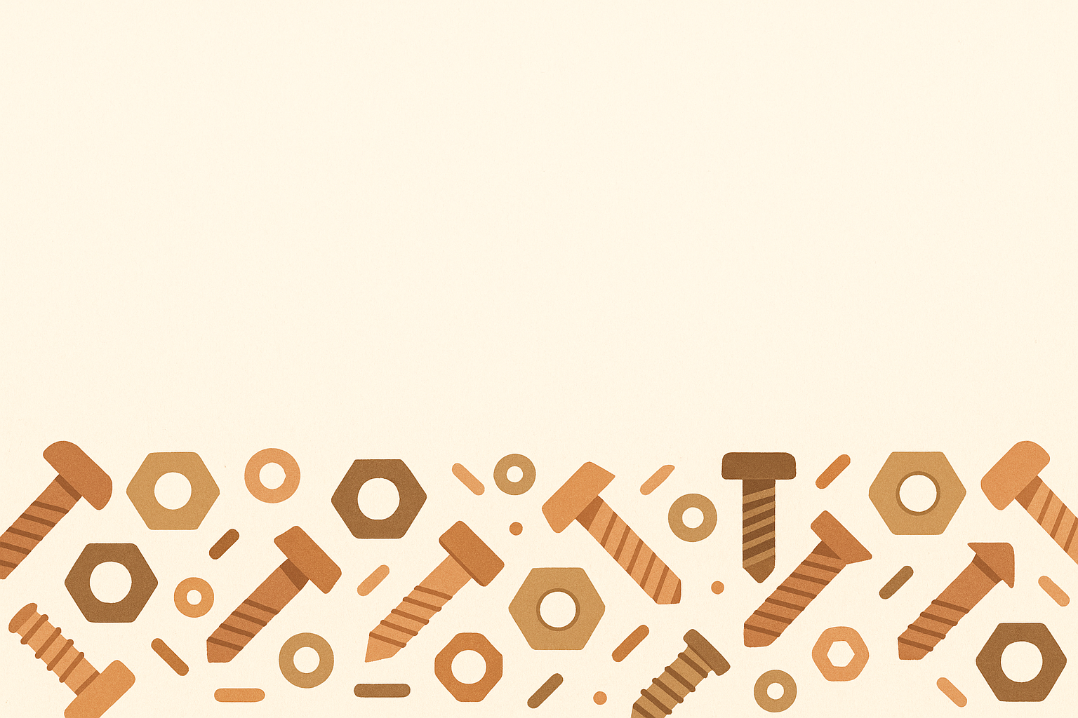 Motif répétitif en bas de carte avec des écrous, boulons, rondelles et vis dans des tons bruns, ocres et cuivrés sur fond beige clair. Style graphique plat et géométrique, ambiance industrielle et technique, parfait pour les entreprises du secteur mécanique, construction ou ingénierie.