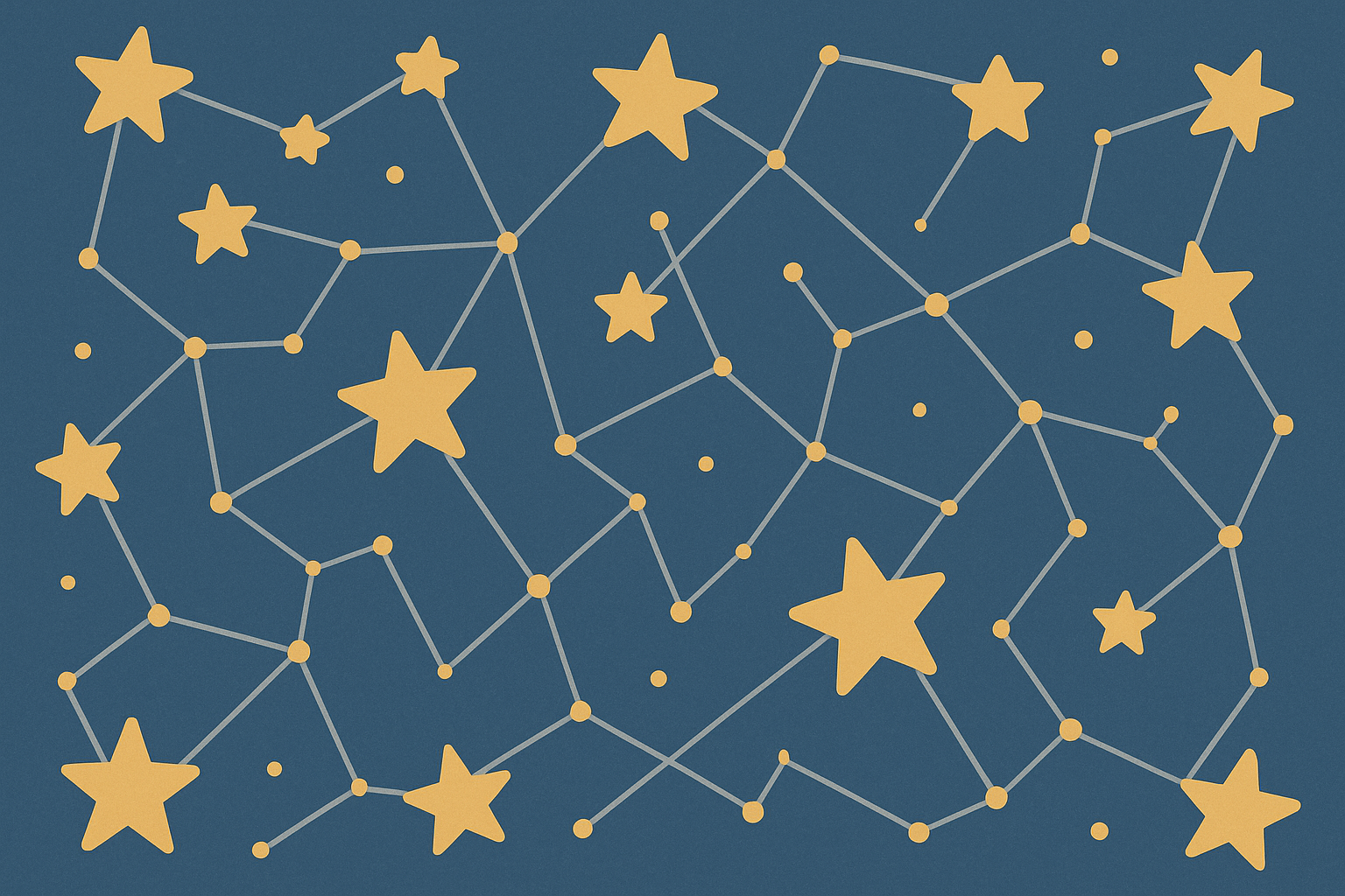 Illustration vectorielle en style pastel avec des éléments doux et plats : lune rose, feuilles vertes, livre ouvert beige, bougie allumée, lunettes rondes dorées, fiole de laboratoire, crayon bleu-vert, étoiles dorées et fleurs roses. Fond blanc cassé, ambiance calme et créative, parfaite pour des designs de papeterie professionnelle ou académique.