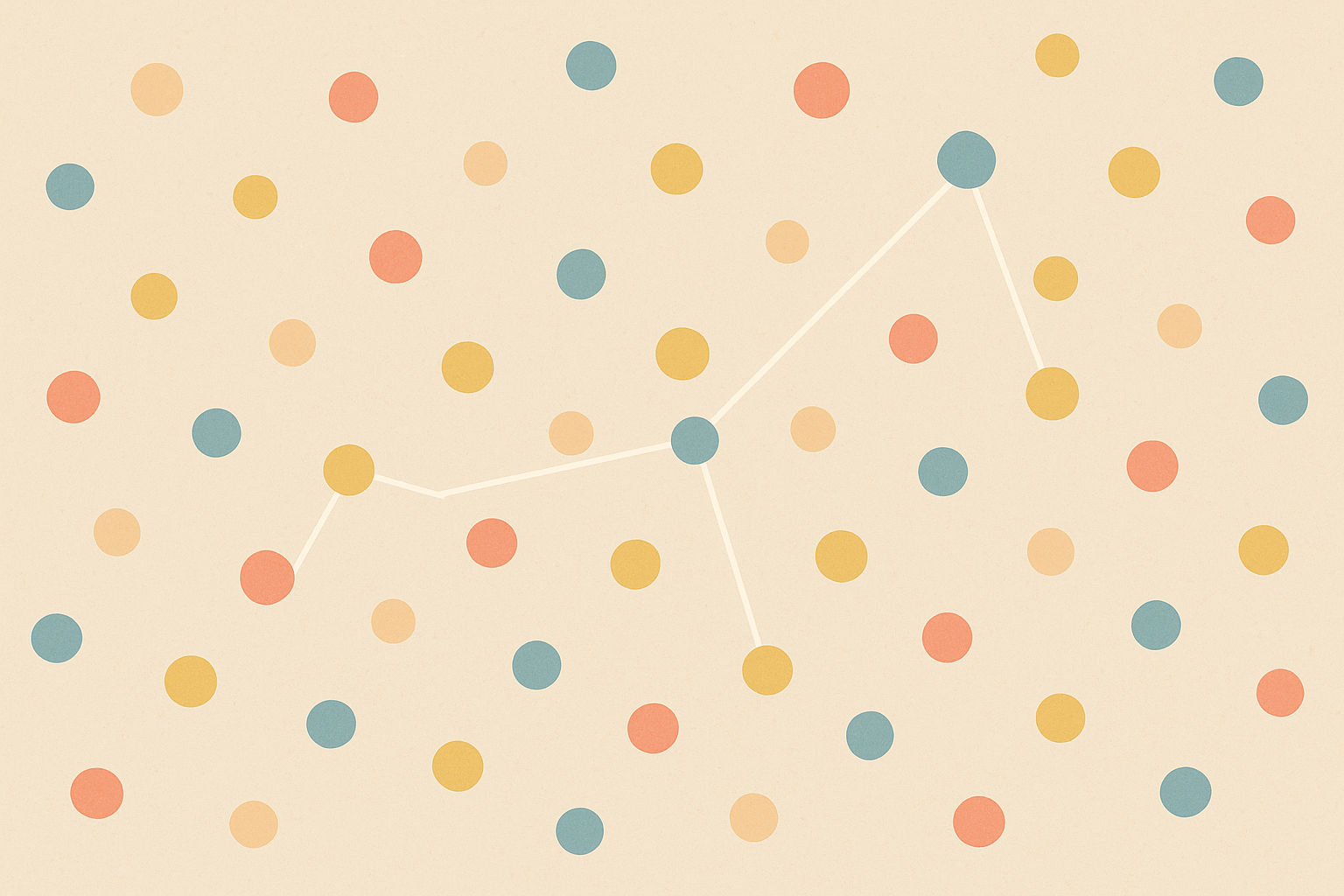 Illustration minimaliste avec des éléments visuels doux en tons pastel : feuille verte, arc-en-ciel orange, étoiles jaunes, livre ouvert beige, tasse de café, crayon, feuille de papier et poire jaune. Fond crème uni avec composition centrée en bas, style épuré et chaleureux, parfait pour ambiance professionnelle conviviale.
