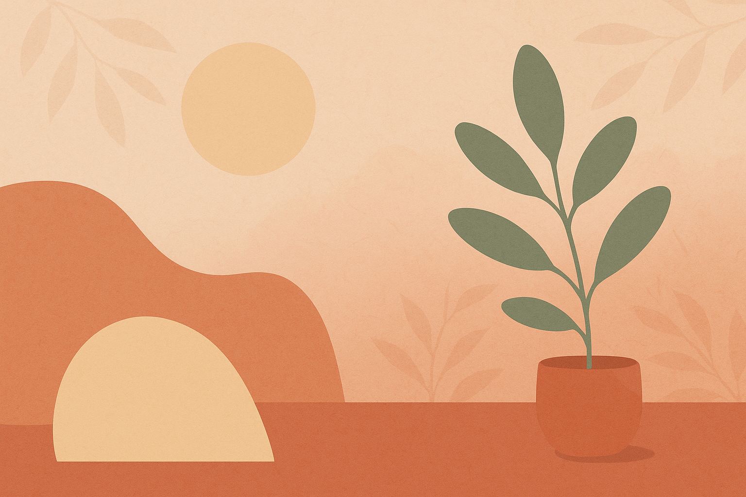 Illustration vectorielle aux tons chauds beige, brun et orange, représentant des icônes de croissance financière : graphique à barres, flèche ascendante, mallette, diagramme circulaire, document, calculatrice et plante stylisée. Style épuré et minimaliste avec un fond dégradé clair, parfait pour les visuels de communication professionnelle et les cartes postales d'affaires.