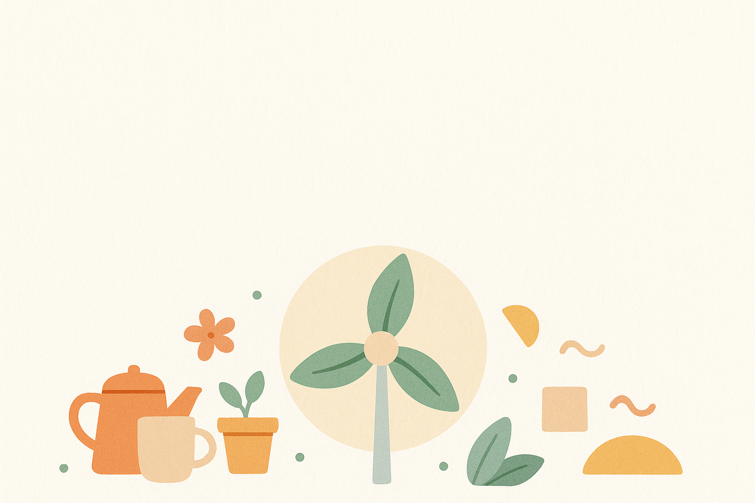 Illustration minimaliste sur fond crème avec des formes stylisées en tons pastel : théière orange, tasse beige, pot de fleur, éolienne verte, feuilles, fleur, formes géométriques jaunes et vertes. Style plat, doux et naturel, évoquant l'écologie, la durabilité et le bien-être. Composition équilibrée en bas de l’image, laissant un grand espace vide pour le texte.