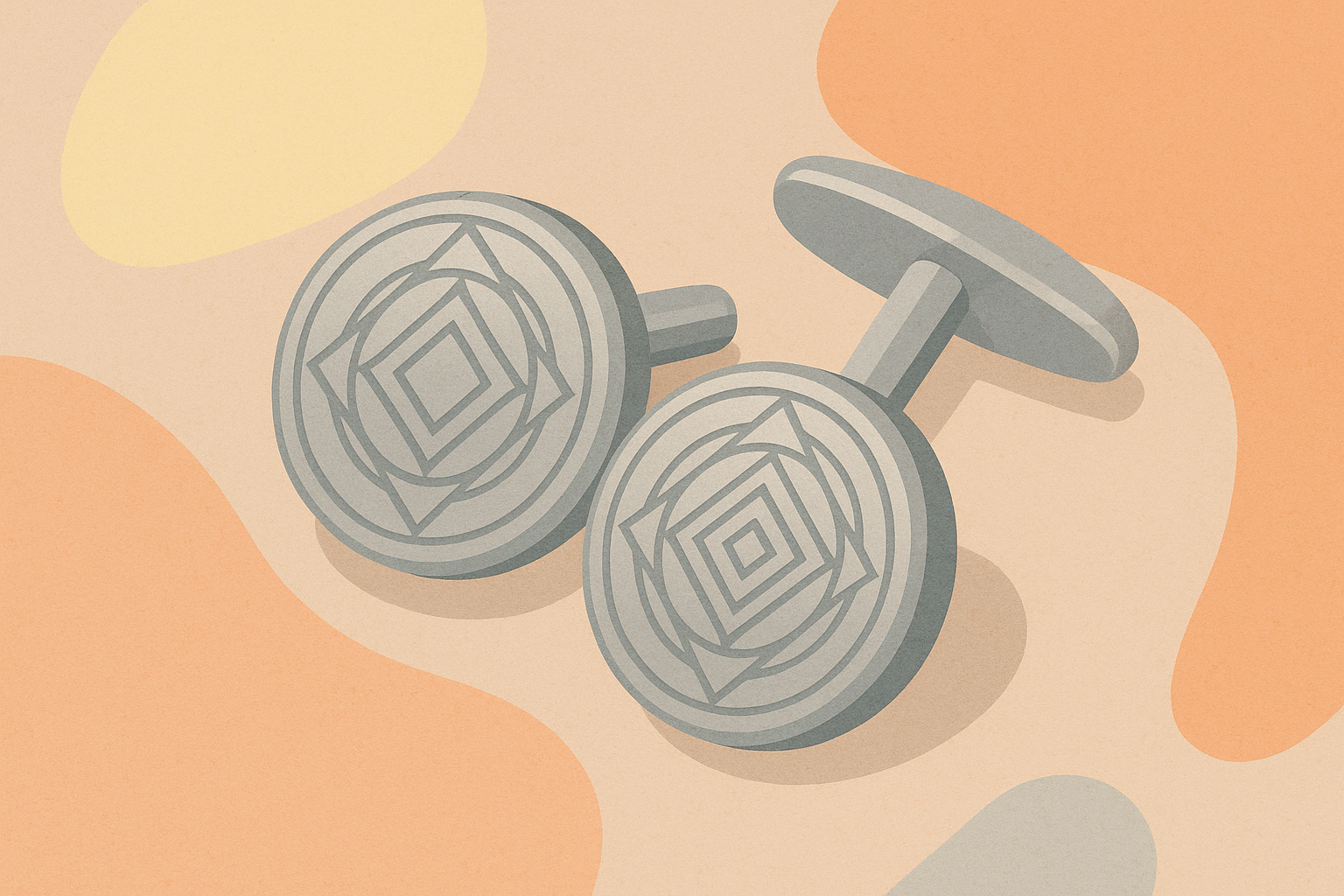 Illustration en tons pastel doux (beige, vert sauge, bleu-gris, ocre) avec des éléments visuels comme nœuds papillon, cravate, ciseaux, boîte à bague, boutons, feuilles, formes géométriques et notes de musique. Style épuré et minimaliste, fond crème clair avec bande décorative en bas. Parfait pour des designs élégants, professionnels et créatifs.