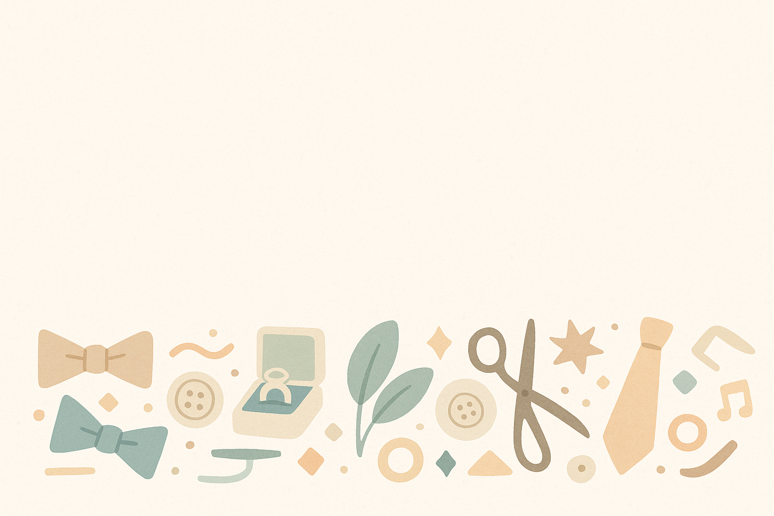 Illustration en tons pastel doux (beige, vert sauge, bleu-gris, ocre) avec des éléments visuels comme nœuds papillon, cravate, ciseaux, boîte à bague, boutons, feuilles, formes géométriques et notes de musique. Style épuré et minimaliste, fond crème clair avec bande décorative en bas. Parfait pour des designs élégants, professionnels et créatifs.