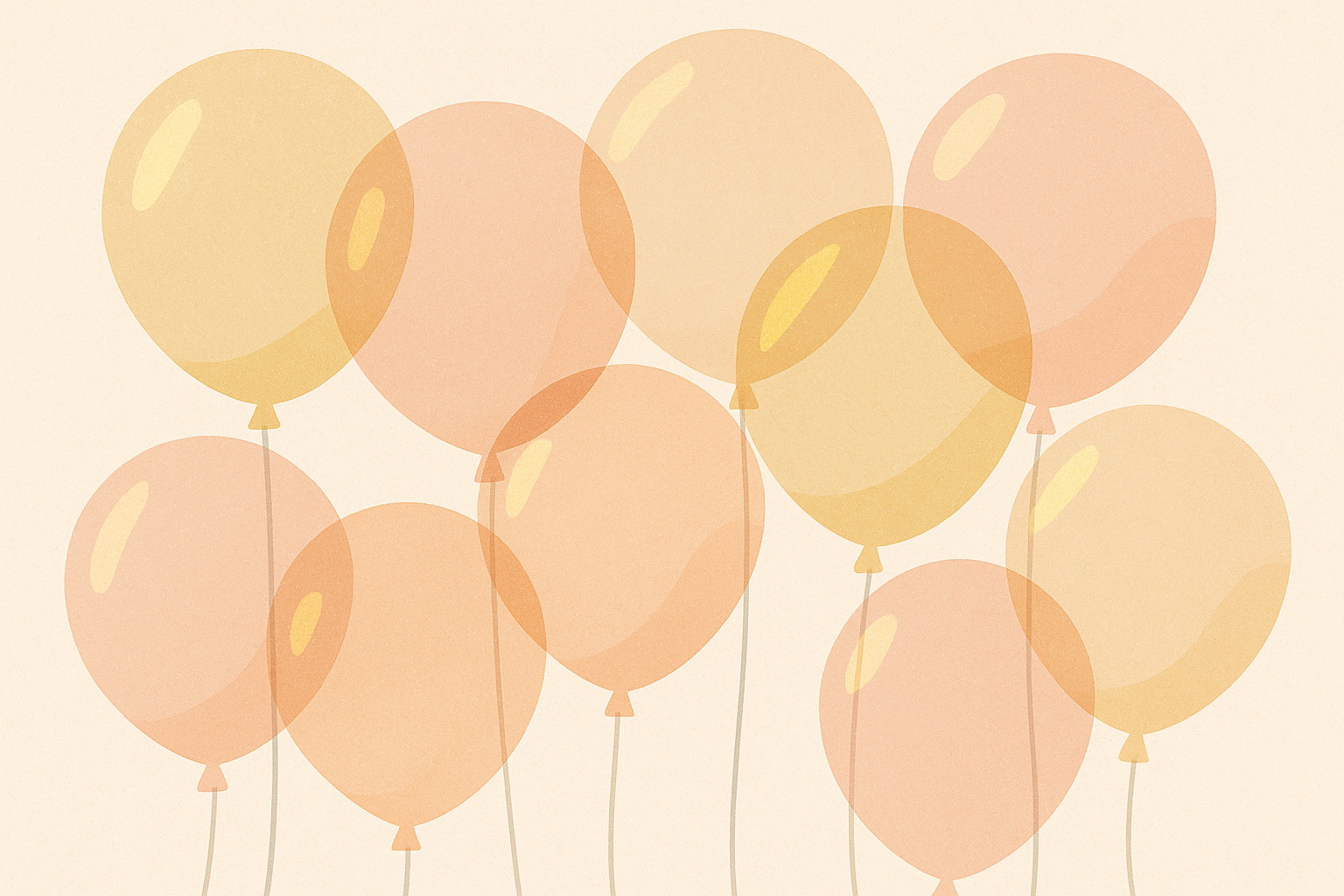 Illustration vectorielle avec des éléments festifs en bas de l'image : cadeau orange, notes de musique, confettis, chapeau de fête rayé orange et beige, étoile, cœur et serpentins. Palette de couleurs douces en tons pastel : orange, bleu, jaune et beige sur fond crème. Style minimaliste et joyeux, parfait pour des communications visuelles professionnelles avec une touche de célébration.