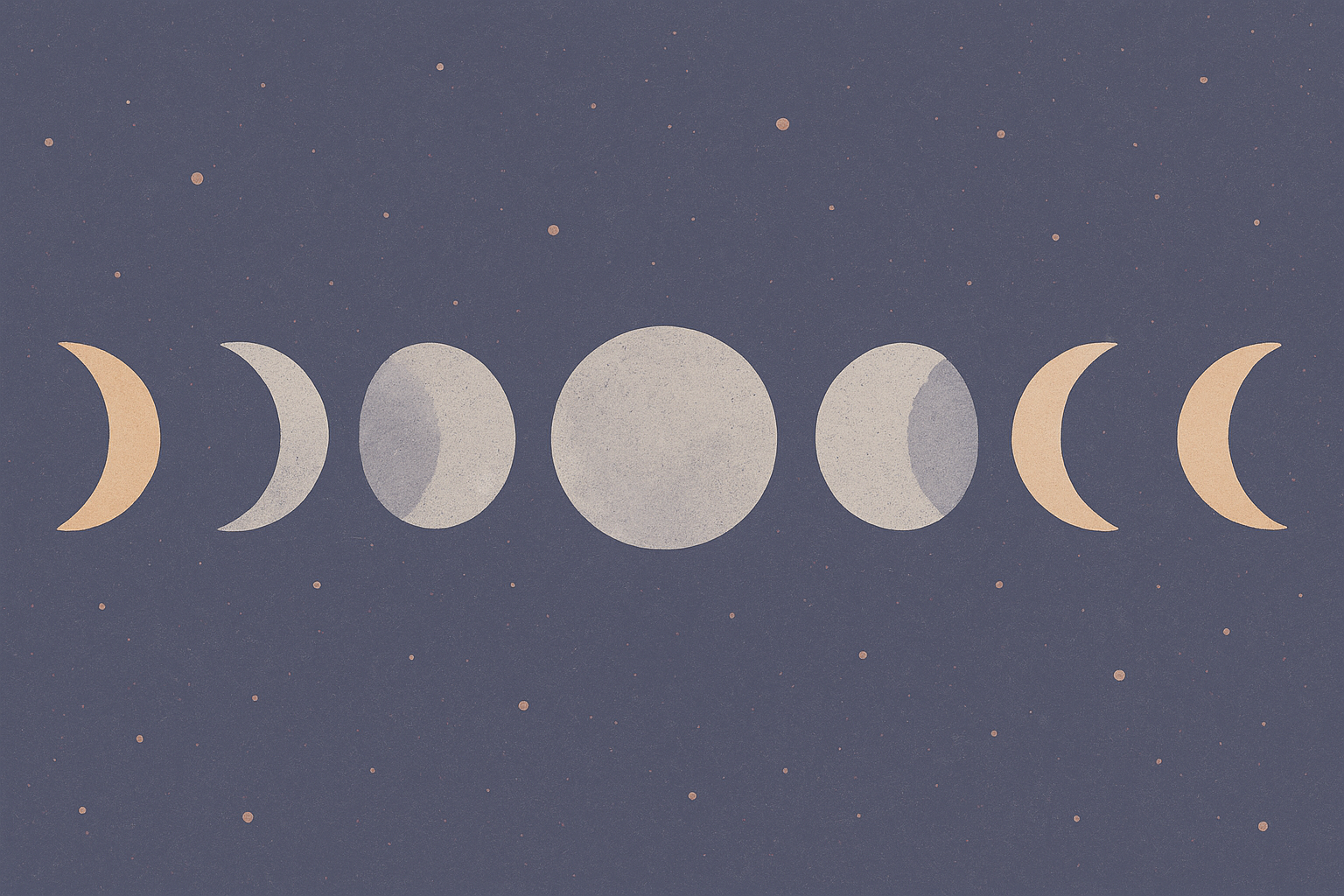 Illustration en style pastel avec des éléments visuels doux : bougie rouge, croissant de lune jaune, livre ouvert avec étoiles, feuillage vert foncé, flacon beige, cristal bleu, bol orange, étoiles et points colorés. Palette de couleurs douces (ocre, vert forêt, bleu pâle, orange brûlé) sur fond crème. Composition linéaire en bas de l'image, laissant un grand espace vide en haut pour le texte ou le message.