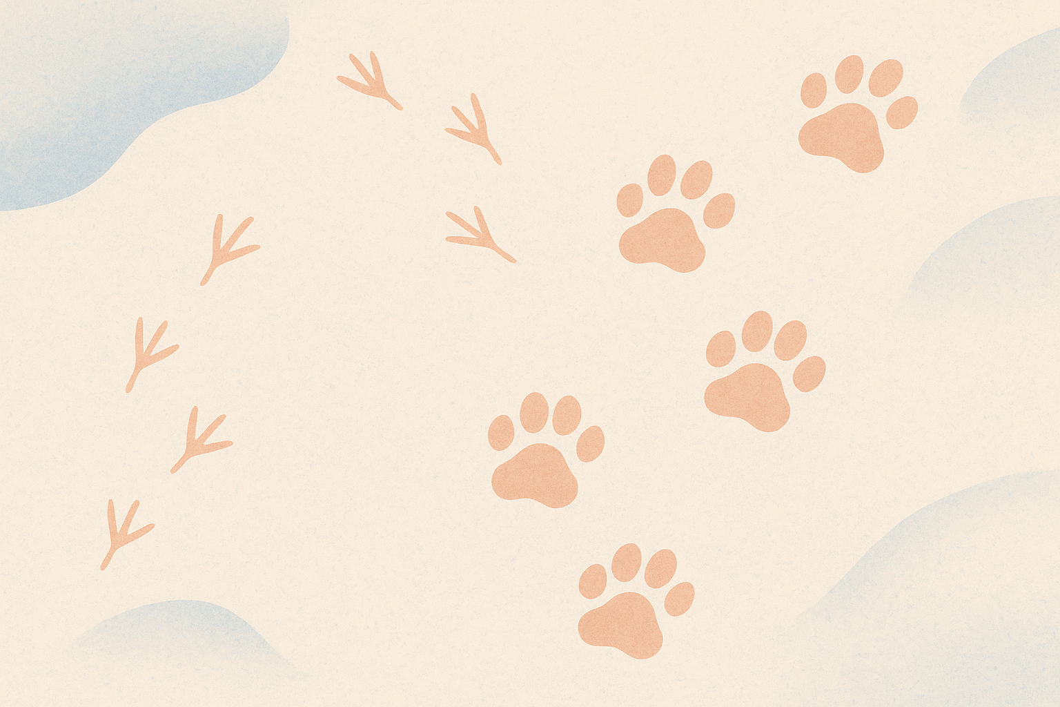 Fond beige clair avec dégradé blanc évoquant un paysage enneigé, orné d’empreintes stylisées de lapin vert d’eau, d’oiseau beige clair et de patte de mammifère brun sable. Design minimaliste, doux et pastel, avec des formes arrondies et une composition équilibrée en bas de l’image, laissant un grand espace vide pour le texte.