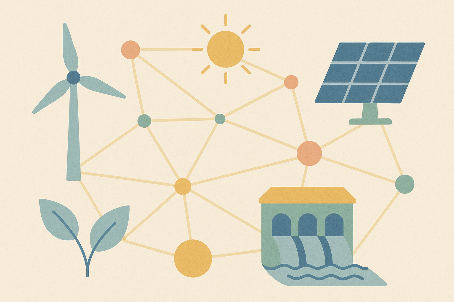 Illustration vectorielle en tons pastel doux avec une éolienne jaune, un soleil stylisé, un panneau solaire bleu foncé, une usine verte avec fumée rose, des collines vertes et bleues, un arbre et des lignes de données pointillées reliant des cercles colorés. Style minimaliste et épuré, fond beige clair, ambiance écologique et professionnelle.