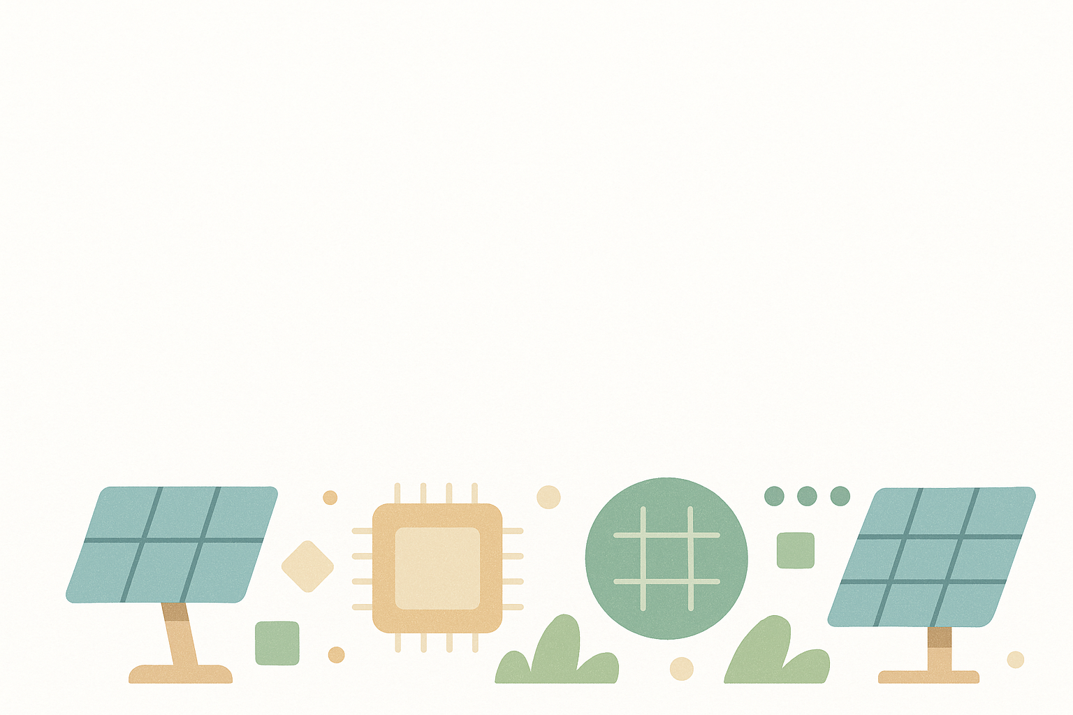 Illustration vectorielle minimaliste avec panneaux solaires bleus, microprocesseur beige, symboles technologiques verts et formes géométriques arrondies. Palette de couleurs pastel douces (bleu, vert, beige) sur fond blanc cassé, style épuré et professionnel, évoquant l'innovation, l'écologie et la technologie.