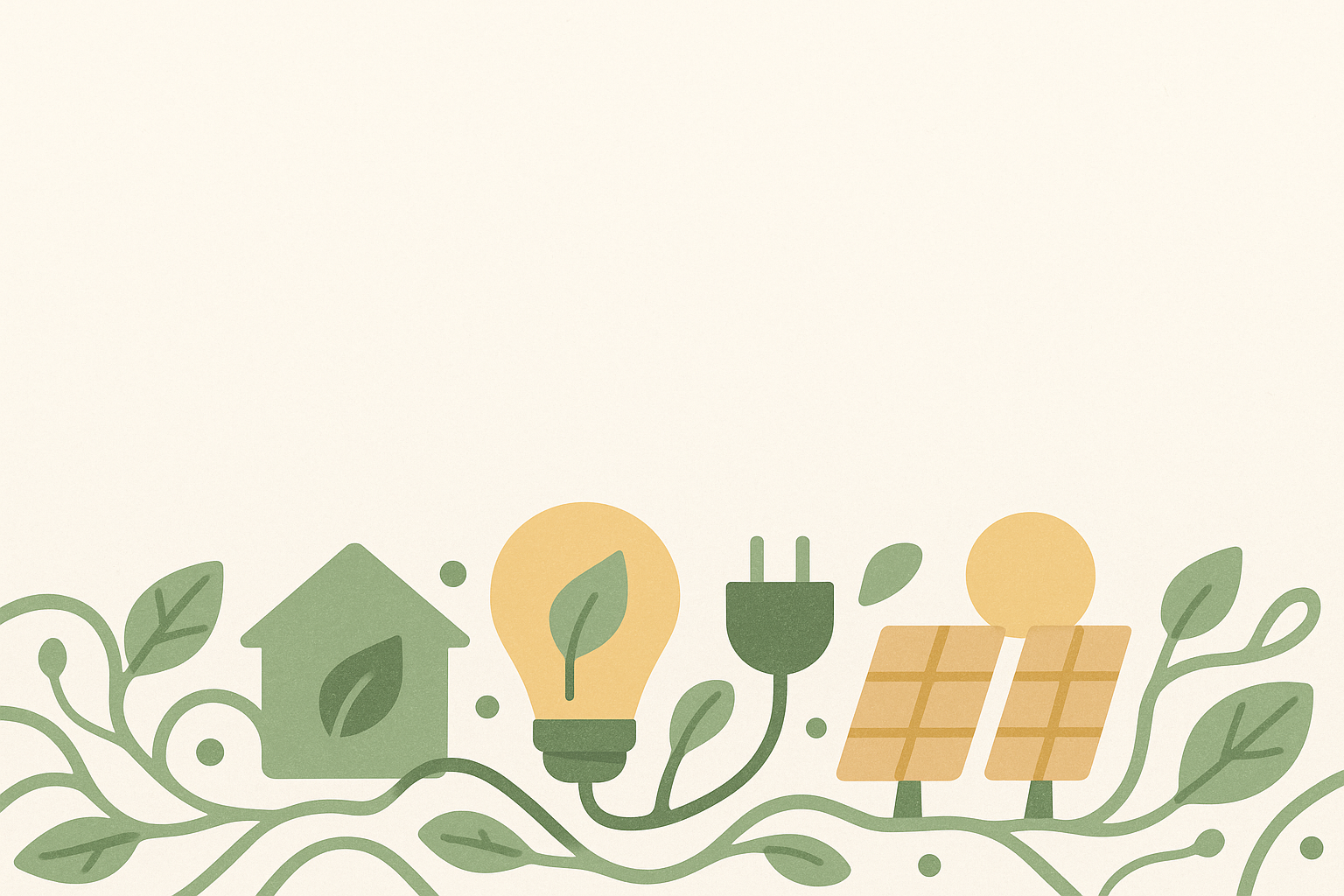 Illustration vectorielle minimaliste avec des tons verts et beiges, représentant une maison écologique, une ampoule avec feuille, une prise électrique, des panneaux solaires et des feuilles entrelacées. Le style est plat, doux et naturel, avec des formes simples et des couleurs pastel évoquant la durabilité, l'énergie renouvelable et l'écologie. Idéal pour des communications visuelles sur l’environnement, l’énergie propre et les entreprises écoresponsables.