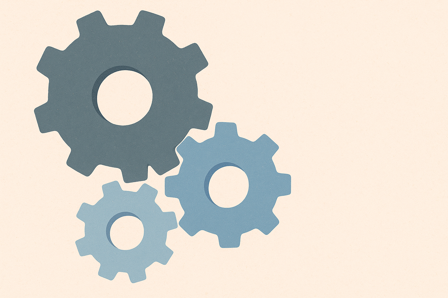 Fond beige clair avec trois engrenages stylisés en dégradés de bleu et gris, positionnés en bas à droite. Style minimaliste, formes géométriques nettes, ambiance professionnelle et technique. Idéal pour les visuels liés à l'industrie, la mécanique, la technologie ou le travail en équipe.