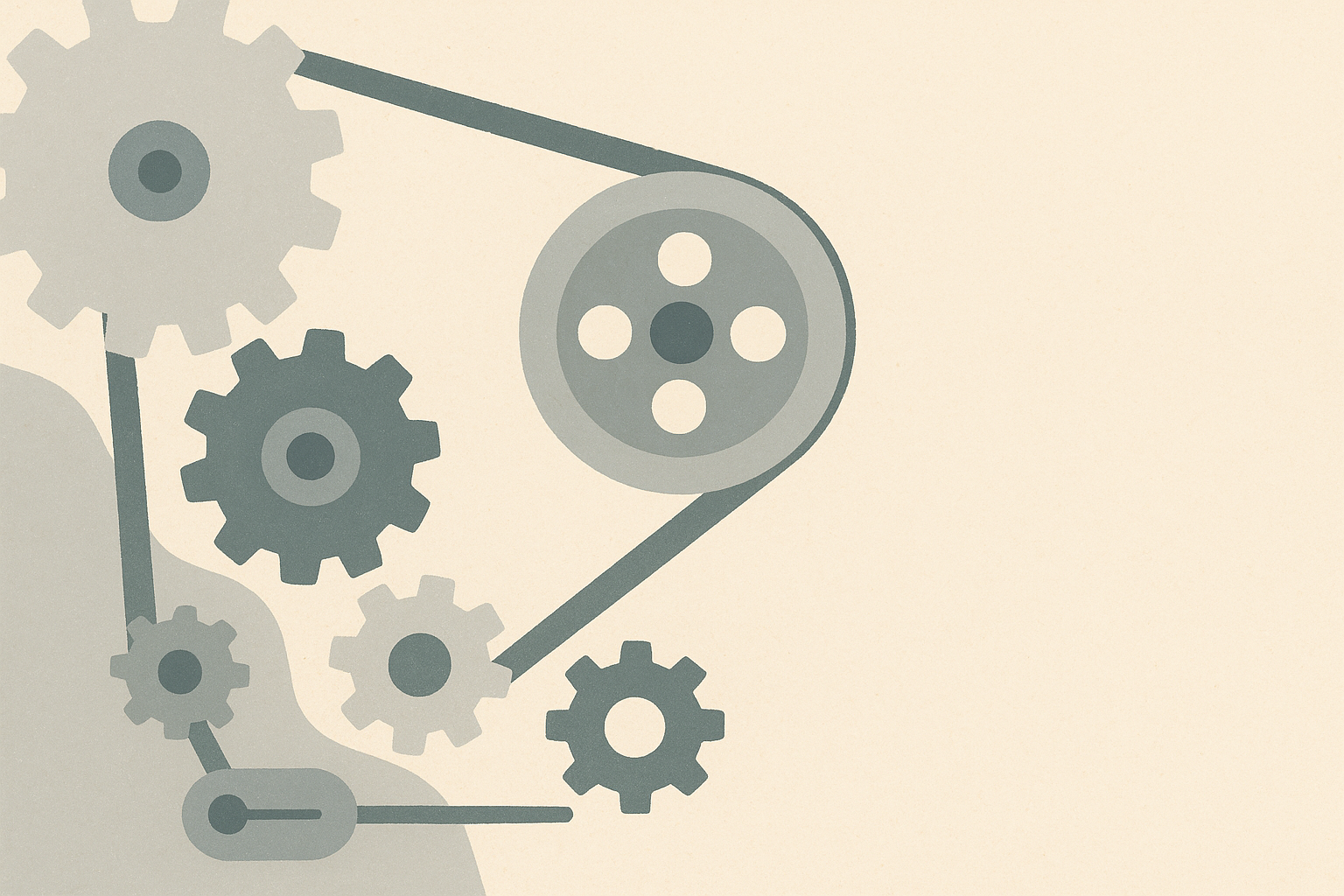 Illustration vectorielle minimaliste avec engrenages gris en rotation, courroie de transmission et formes géométriques abstraites sur fond beige clair. Palette monochrome en nuances de gris, style industriel moderne, composition dynamique avec effet de mouvement. Idéal pour visuels professionnels, communication B2B, cartes postales d'entreprise.