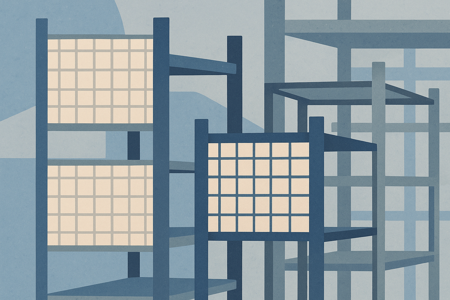Illustration vectorielle minimaliste représentant des étagères d'entrepôt et des structures métalliques en tons bleu-gris, beige et crème. Les formes géométriques simples et les lignes droites créent une ambiance industrielle moderne. Le style plat et les couleurs douces donnent un aspect professionnel, sobre et contemporain, parfait pour des supports de communication visuelle.