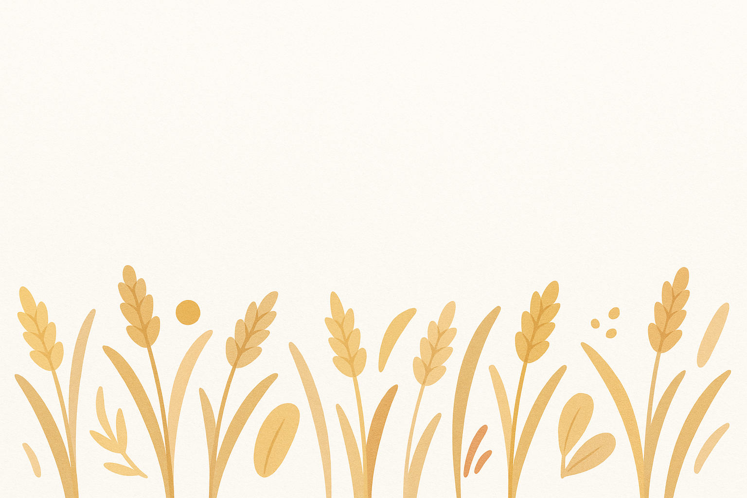 Illustration vectorielle de style minimaliste avec des épis de blé dorés, des feuilles et des formes organiques sur fond crème texturé. Couleurs chaudes allant du beige au jaune miel, composition équilibrée avec espace vide en haut pour texte. Parfait pour ambiance naturelle, rustique et professionnelle.