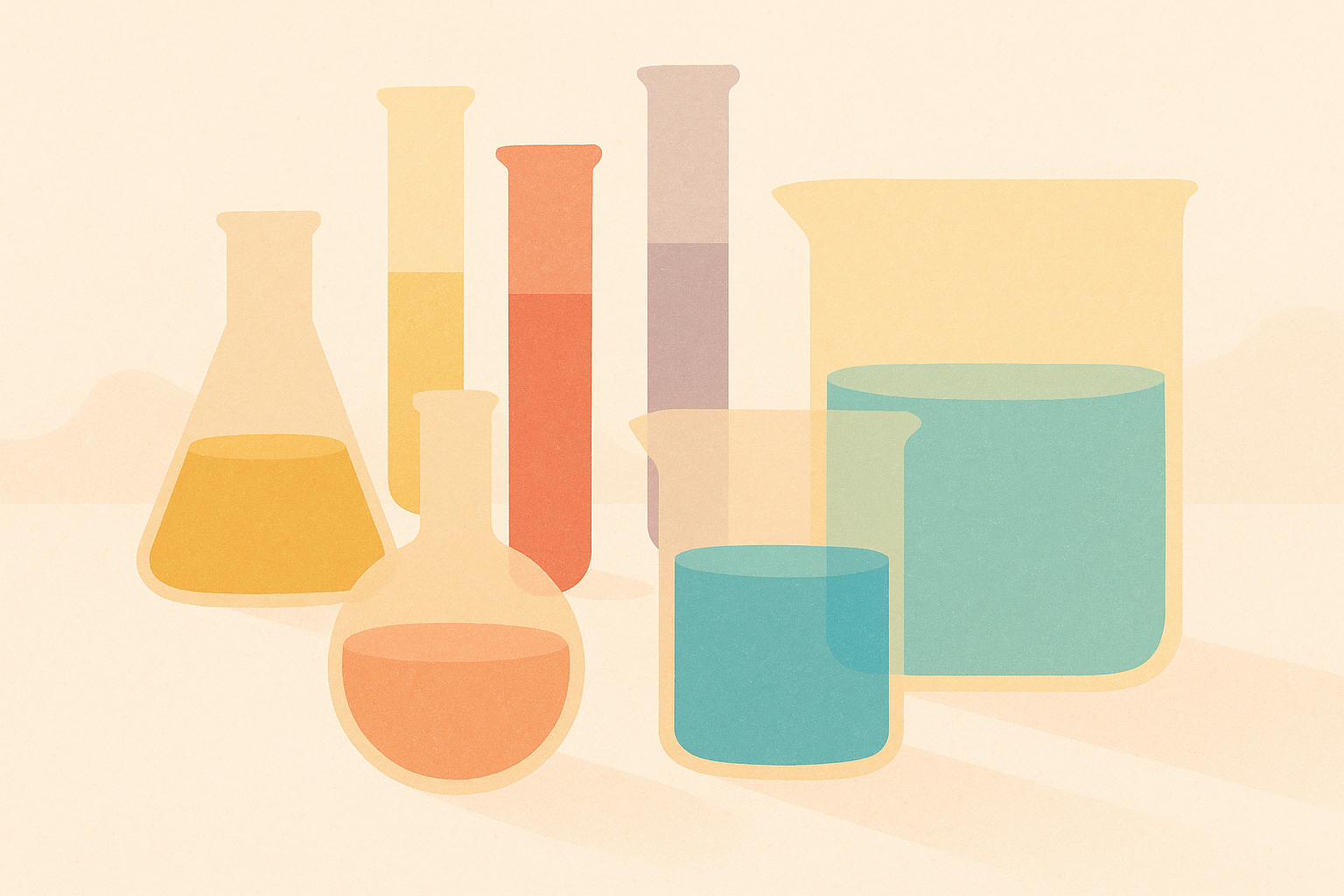 Illustration minimaliste de verrerie de laboratoire avec des fioles, béchers et tubes à essai remplis de liquides pastel (jaune, orange, rose, bleu). Fond crème uni, style plat et épuré, parfait pour un thème scientifique, médical ou chimique. Composition équilibrée avec des formes géométriques douces et des couleurs douces.