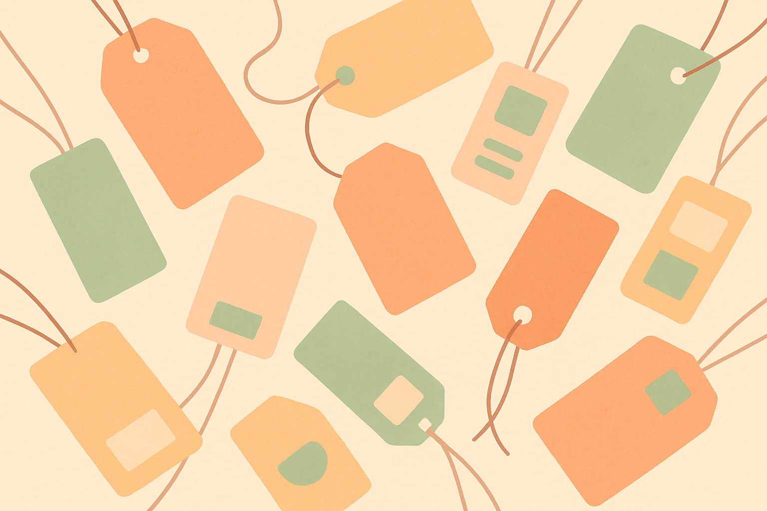 Fond crème avec une bordure inférieure composée d’étiquettes illustrées en tons pastel (orange, bleu-vert, jaune, beige). Les étiquettes ont des formes variées : rectangulaires, rondes, avec ou sans lignes décoratives. Style minimaliste et épuré, ambiance douce et professionnelle, parfait pour la correspondance commerciale.