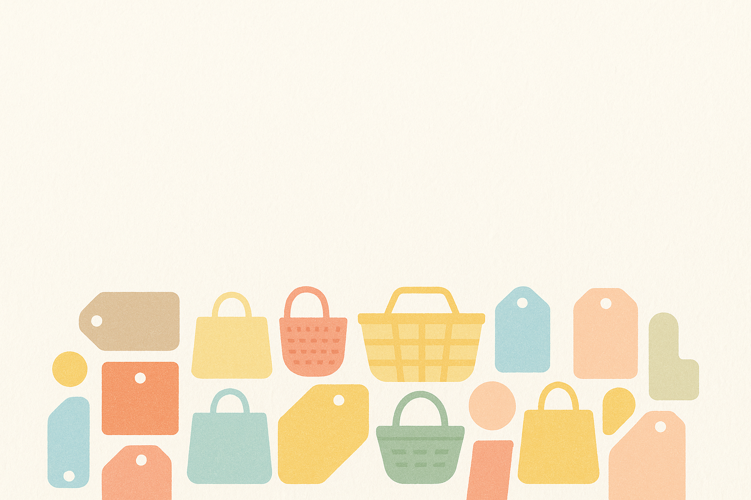 Motifs vectoriels plats de paniers, sacs de courses et étiquettes en couleurs pastel (jaune, bleu, vert, orange, rouge, beige) sur fond crème texturé. Les formes géométriques simples et arrondies sont disposées en bandeau horizontal en bas de l'image, laissant un grand espace vide en haut pour le texte. Style minimaliste, ambiance douce et professionnelle, parfait pour le commerce de détail, le branding ou les messages B2B.
