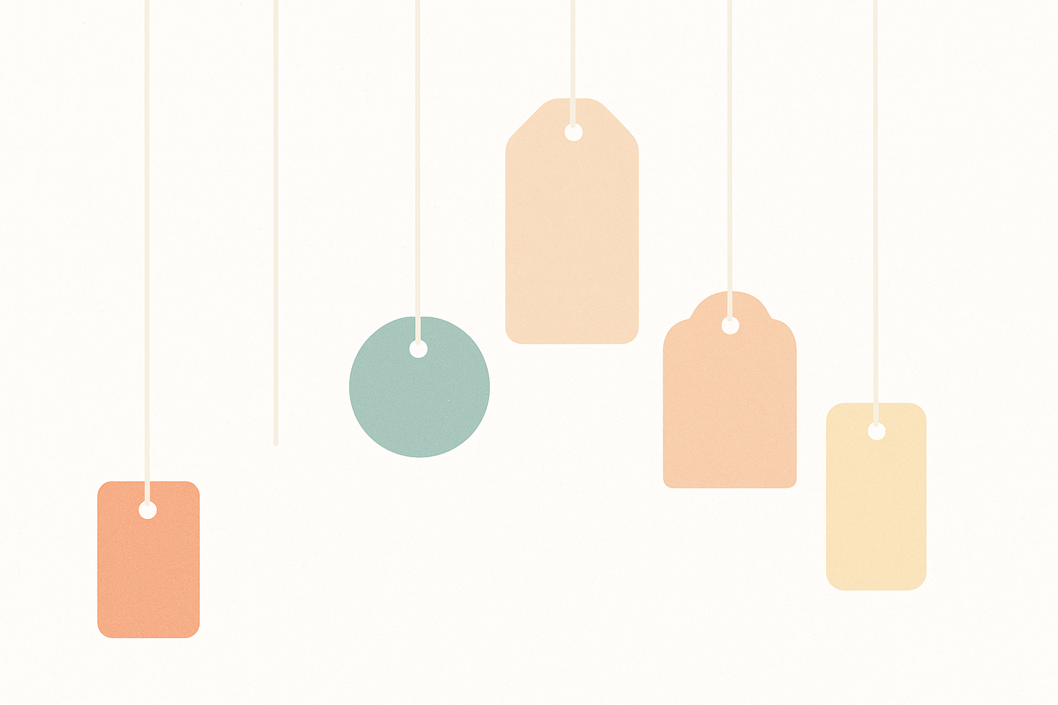Illustration minimaliste sur fond blanc cassé avec six étiquettes suspendues de formes variées (rectangles, cercle) en tons pastel : orange, vert d’eau, pêche, beige, jaune. Les étiquettes sont reliées par des ficelles fines verticales, créant un effet de suspension aérien et ordonné. Style graphique épuré, ambiance douce et professionnelle, parfaite pour supports de communication visuelle.