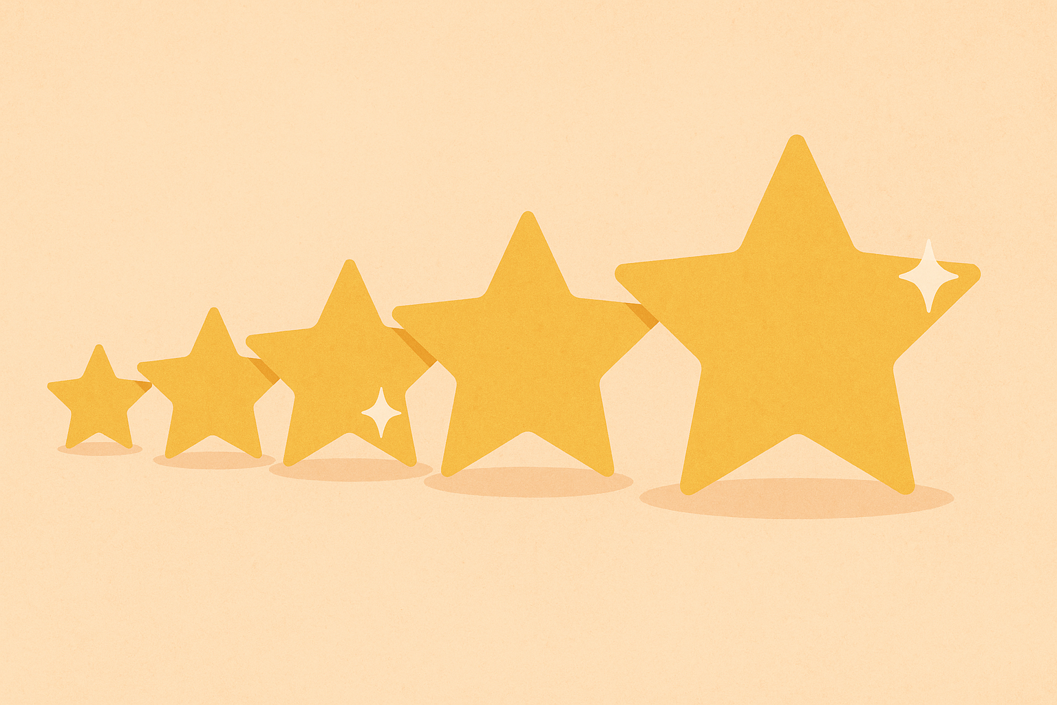 Illustration minimaliste sur fond crème avec cinq étoiles dorées disposées en ligne croissante de gauche à droite. Chaque étoile est pleine, avec des ombres douces au sol et quelques reflets brillants blancs accentuant la texture. Style épuré, couleurs chaudes et ambiance professionnelle adaptée à la communication d'entreprise.