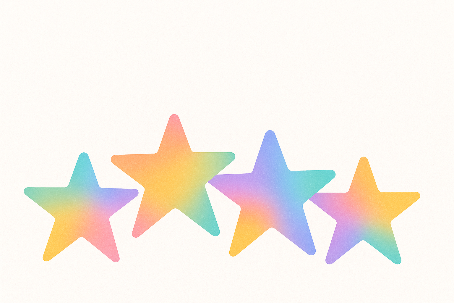 Fond blanc texturé avec quatre grandes étoiles à cinq branches en bas de l'image, affichant un dégradé pastel multicolore allant du rose, bleu, violet, vert au jaune. Style doux, lumineux et moderne avec effet légèrement granuleux. Composition centrée et équilibrée, idéale pour un usage professionnel ou créatif.