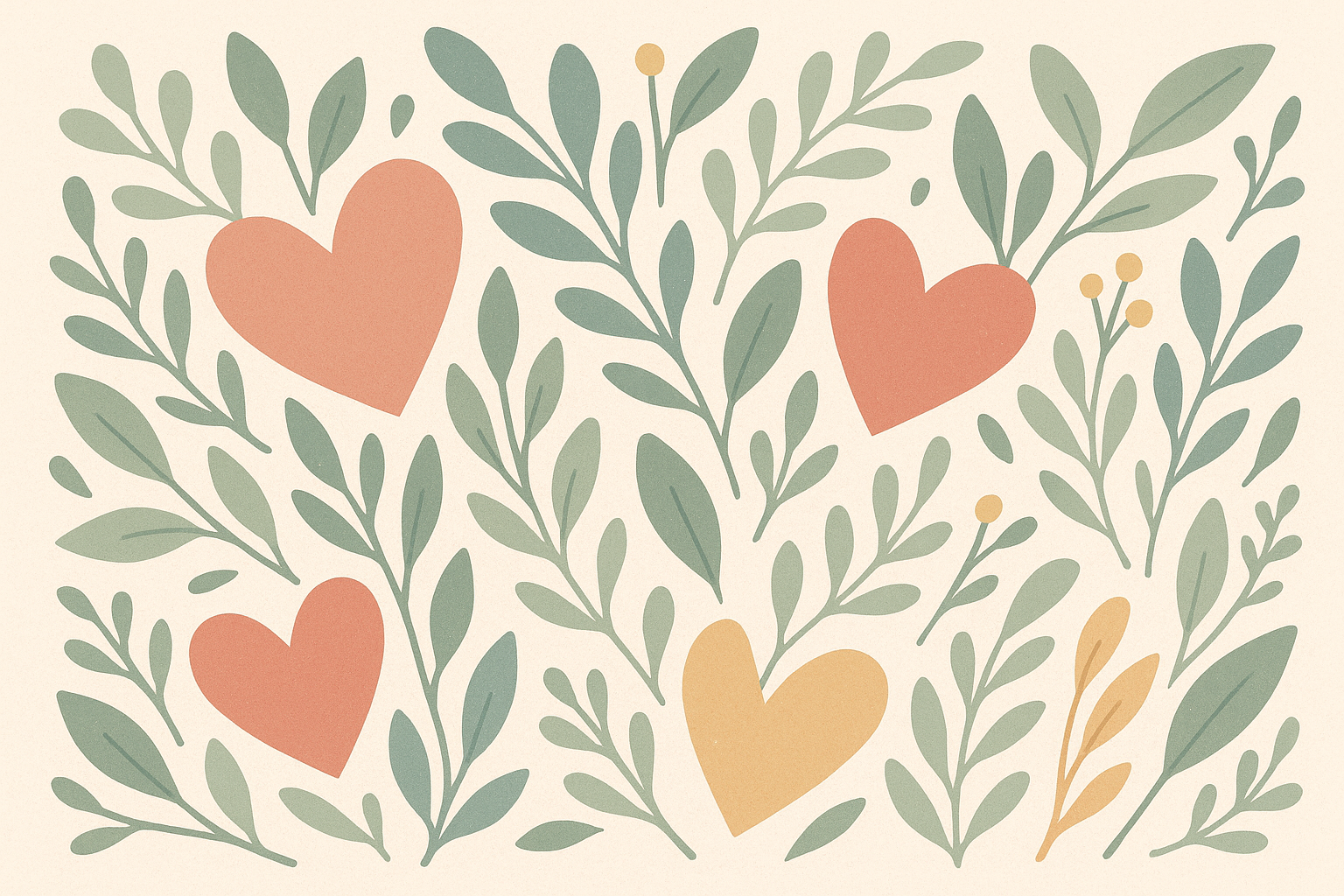 Motif en bas de carte avec feuillage stylisé et cœurs dans des tons pastel doux : vert olive, vert sauge, orange pêche et jaune doré. Fond crème uni avec espace vide en haut pour texte. Style minimaliste, organique et chaleureux, parfait pour ambiance professionnelle douce et naturelle.