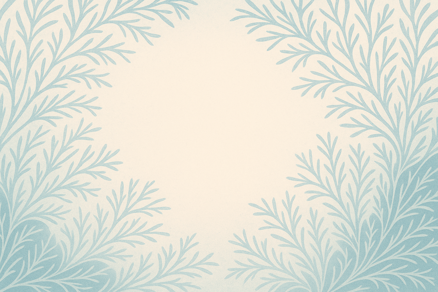 Motif de feuillage stylisé en dégradé bleu clair sur fond crème, avec des branches fines et symétriques évoquant des plantes givrées. Design minimaliste, naturel et apaisant, parfait pour des cartes postales à usage professionnel. Couleurs douces, style épuré, ambiance calme et professionnelle.
