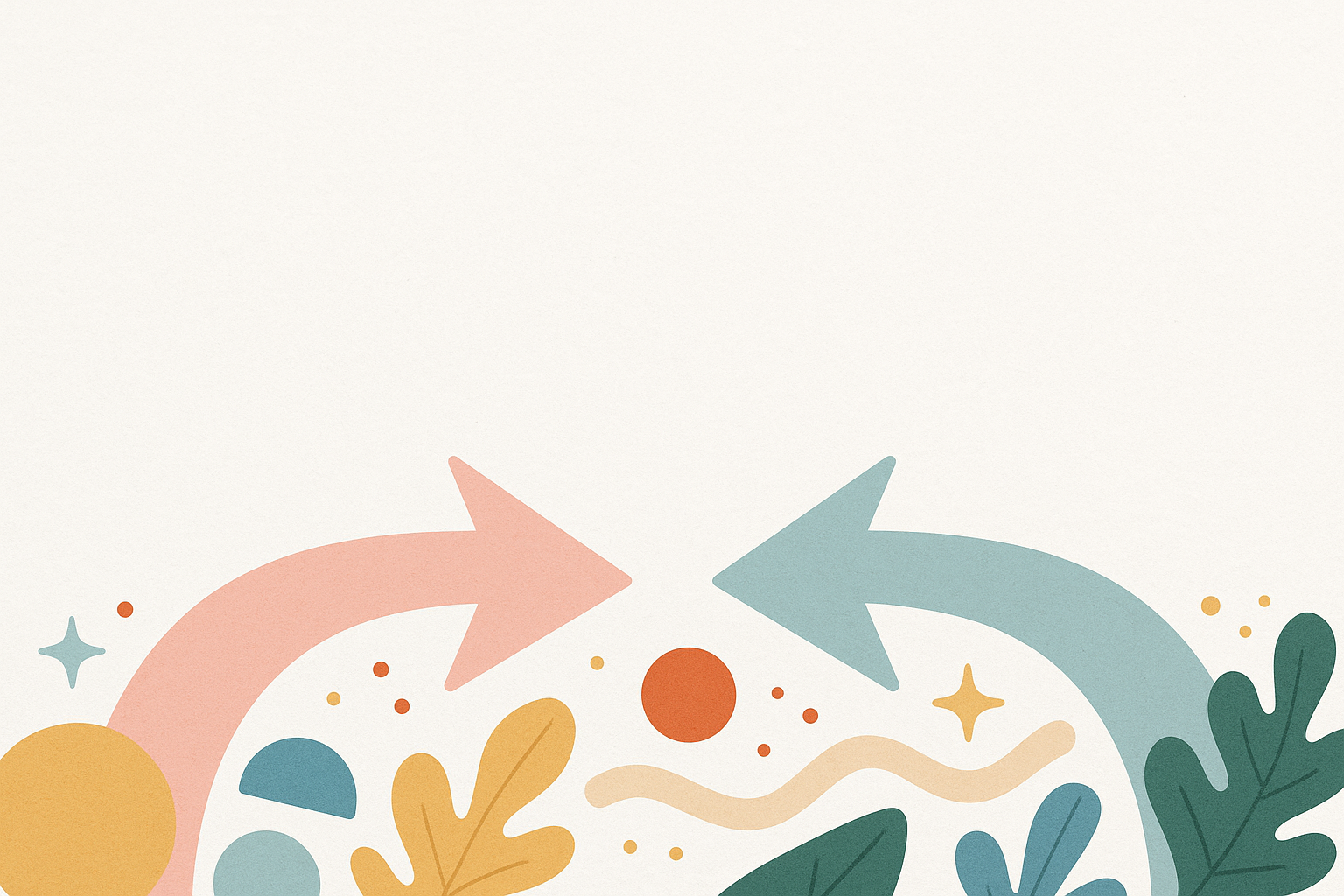 Fond crème avec deux grandes flèches courbées opposées, l'une rose saumon et l'autre bleu-vert, entourées d'éléments graphiques abstraits : feuilles stylisées vert foncé et jaune moutarde, cercles rouges et bleus, étoiles et lignes ondulées. Palette pastel douce avec des formes organiques et géométriques, ambiance moderne et professionnelle.