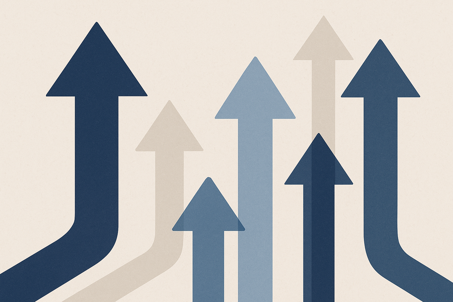 Fond beige clair avec un motif de flèches pointant vers le haut en bleu marine et gris clair. Les flèches sont de tailles variées, disposées en bas de l'image, créant un effet de mouvement ascendant. Design minimaliste, géométrique et professionnel, évoquant la croissance, la réussite et l'évolution dans un style épuré et corporatif.