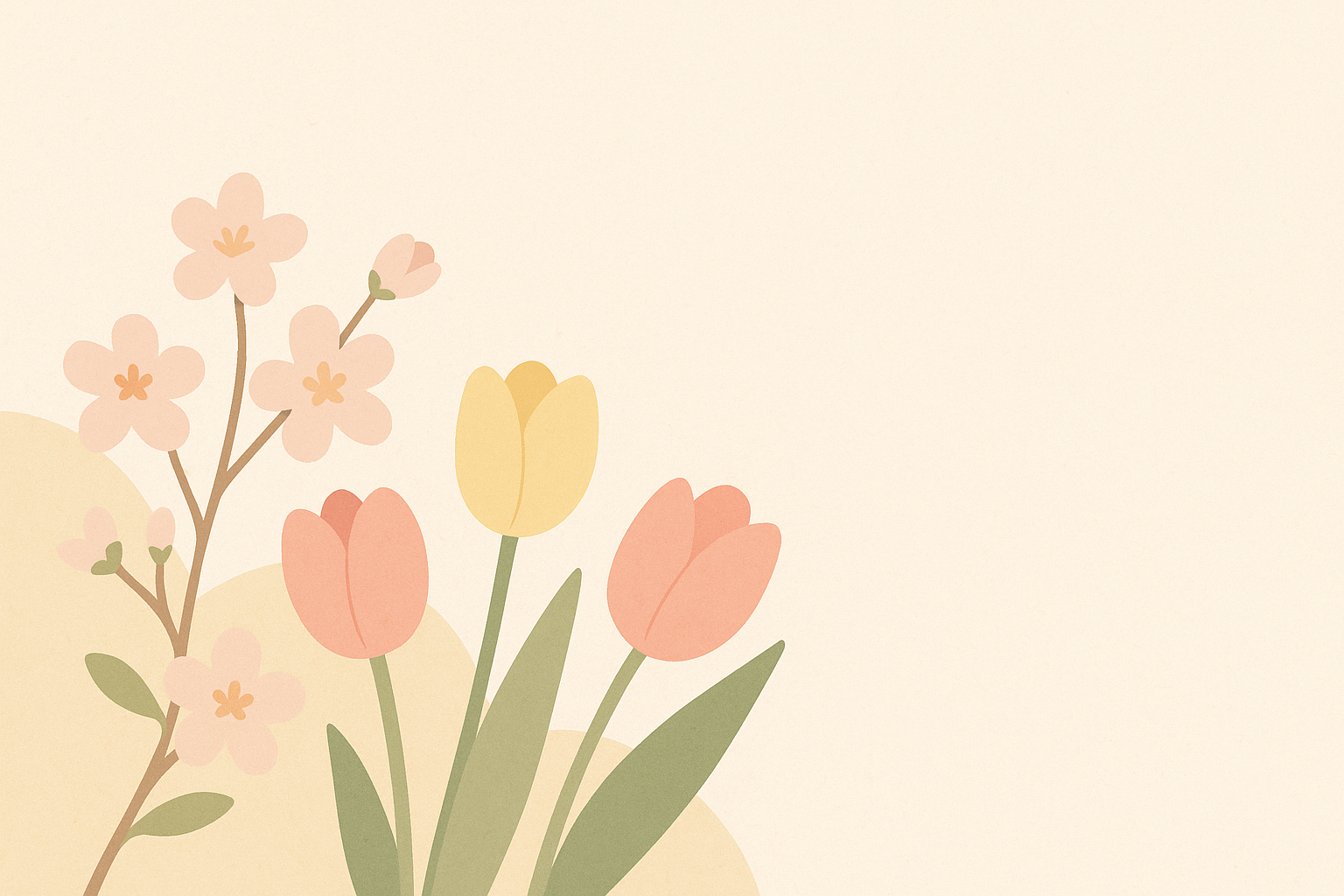 Illustration minimaliste avec des tulipes jaunes et roses et des fleurs de cerisier stylisées en rose pâle, sur fond crème texturé. Couleurs pastel douces, composition florale en bas à droite, style épuré et professionnel. Idéal pour ambiance printanière, naturelle et élégante.